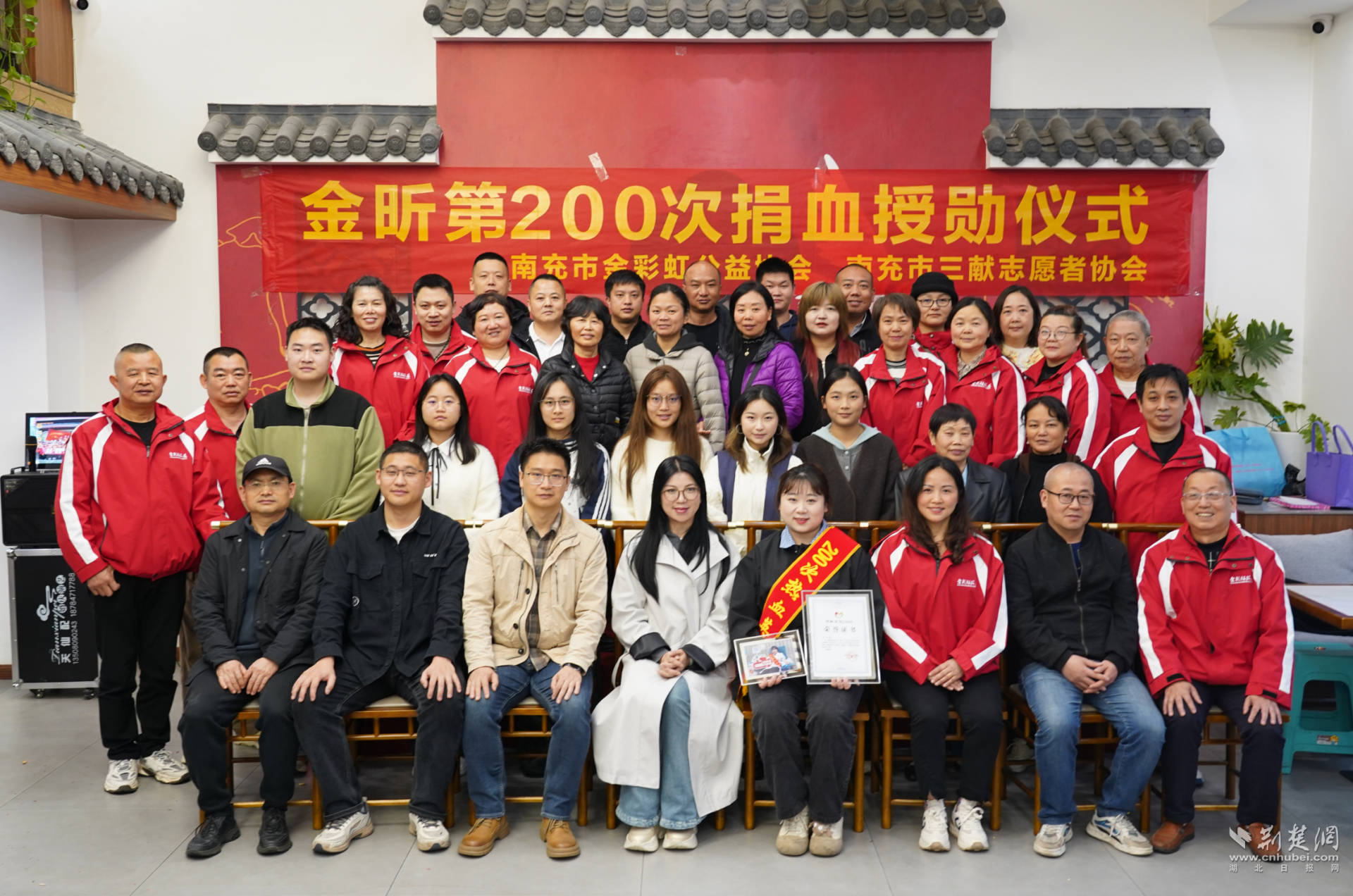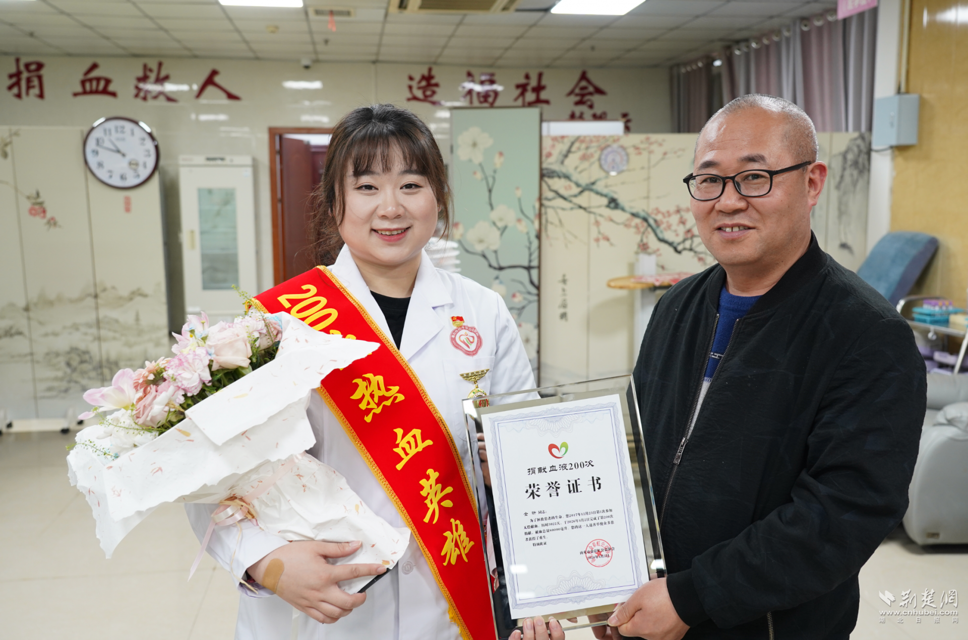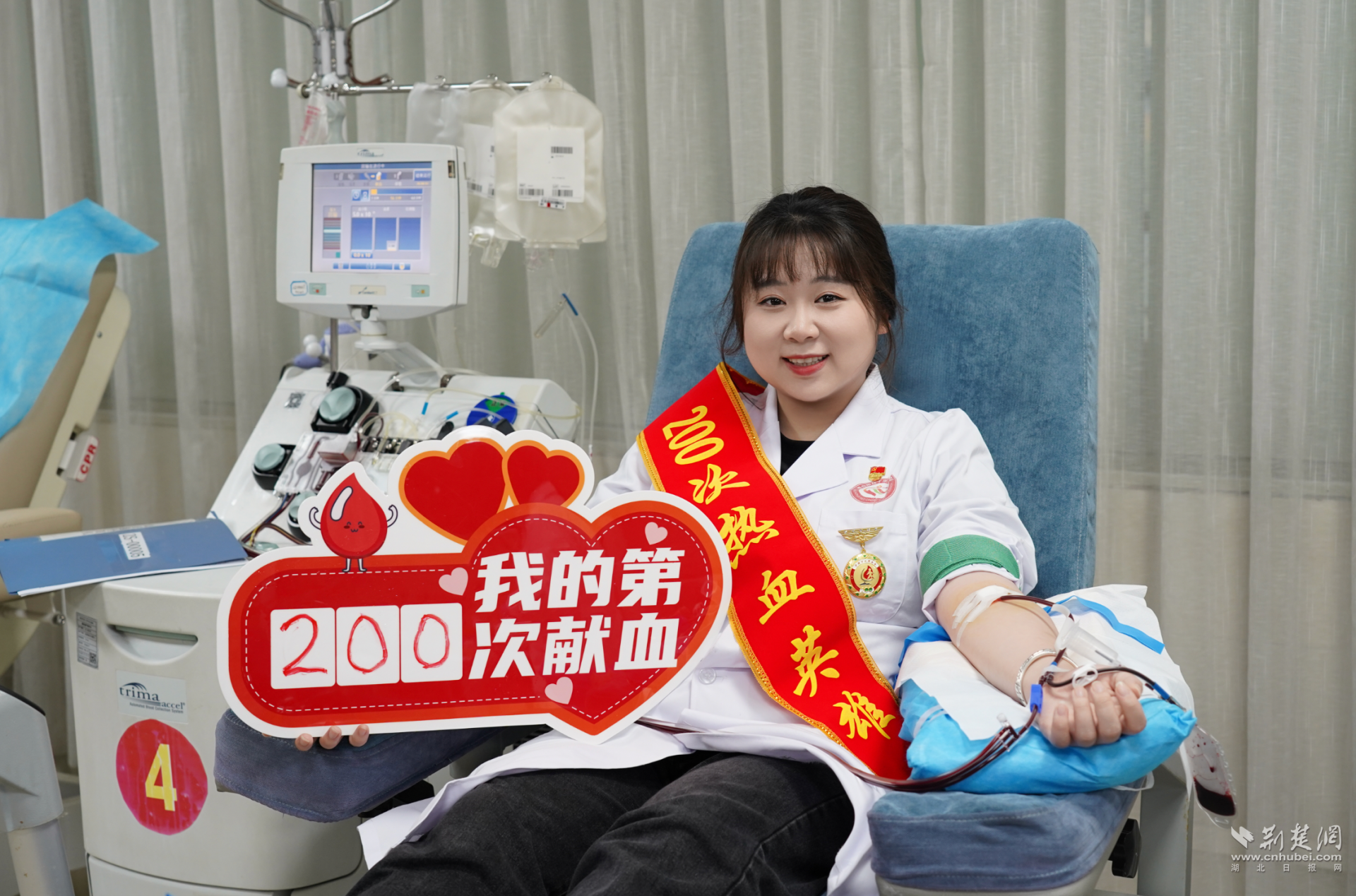 荆楚网(湖北日报网)讯(记者林杉 通讯员肖新俊 李思玉)4月2日上午,四川省南充中心血站二楼机采大厅内,金昕穿上白大褂,肩上披着“200次热血英雄”的绶带,坐上了那张献血椅。这是她第200次无偿献血。