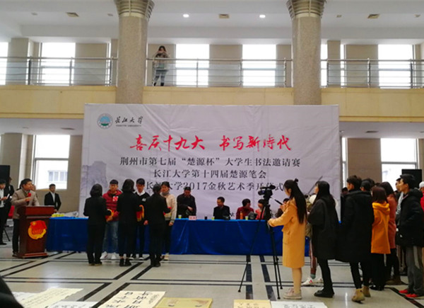湖北日报网消息(通讯员 娄修明)喜庆十九大,书写新时代。11月19日,荆州市第七届“楚源杯”大学生书法邀请赛暨长江大学第十四届楚源笔会在长江大学举行。在决赛环节,武汉职业技术学院商学院物流管理16301班孙庭宇现场创作的行书作品,受到评委青睐,最终荣获软笔组一等奖。