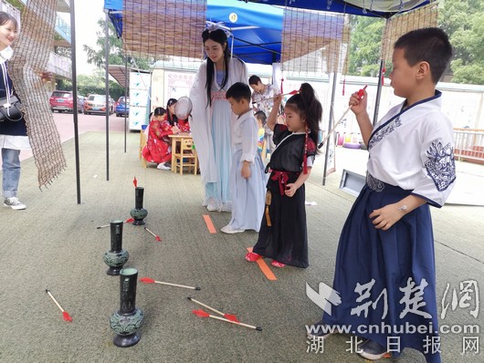 幼儿园老师为孩子们精心准备了扎染艺术、栩栩如生(捏面人)、百发百中(套圈游戏)、百步穿杨(射箭)、窗间花影(剪窗花)、粽情粽意、编蛋兜、七巧世界、九连环、投壶等21个民俗游戏展位。每个孩子有18张参与券,可以凭借1~3张券兑换在不同展位体验的权利。游戏之余,还有民乐演奏,烘托氛围。