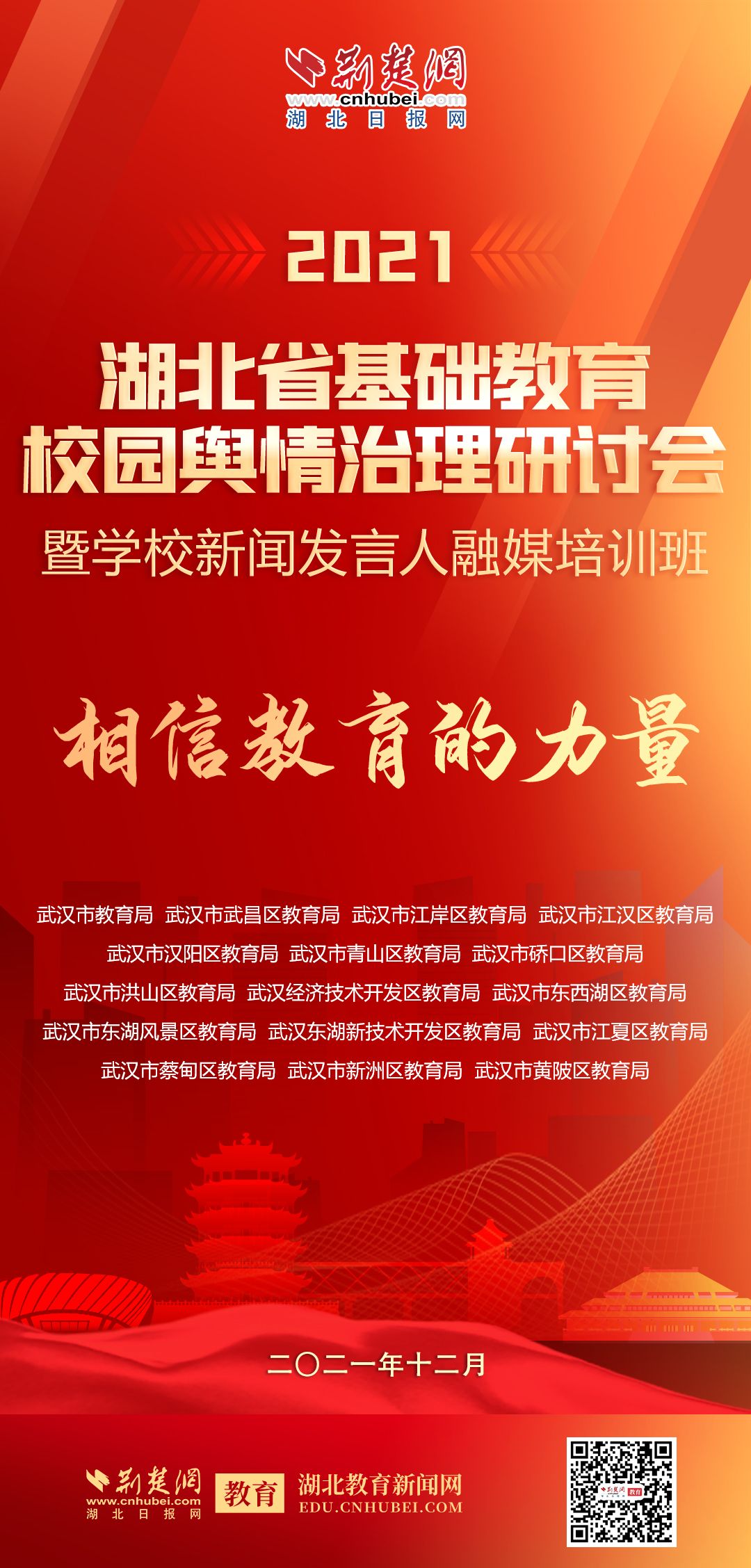 荆楚网(湖北日报网)讯(记者齐一璇、许文秀、刘建维、刘雄 通讯员杨国涛)学校管理者如何提升舆情分析和处置突发事件的能力?如何借助主题活动、文化建设打造校园特色文化?如何紧扣时代主题,助推基础教育高质量发展?12月24日,湖北省150余所中小学幼儿园的校长、书记们相聚东湖之滨,在荆楚网(湖北日报网)主办的“2021湖北省基础教育校园舆情治理研讨会暨学校新闻发言人融媒培训班”上,开展交流研讨,共话基础教育高质量发展,分享校园治理创新实践,传递基础教育发展强音。