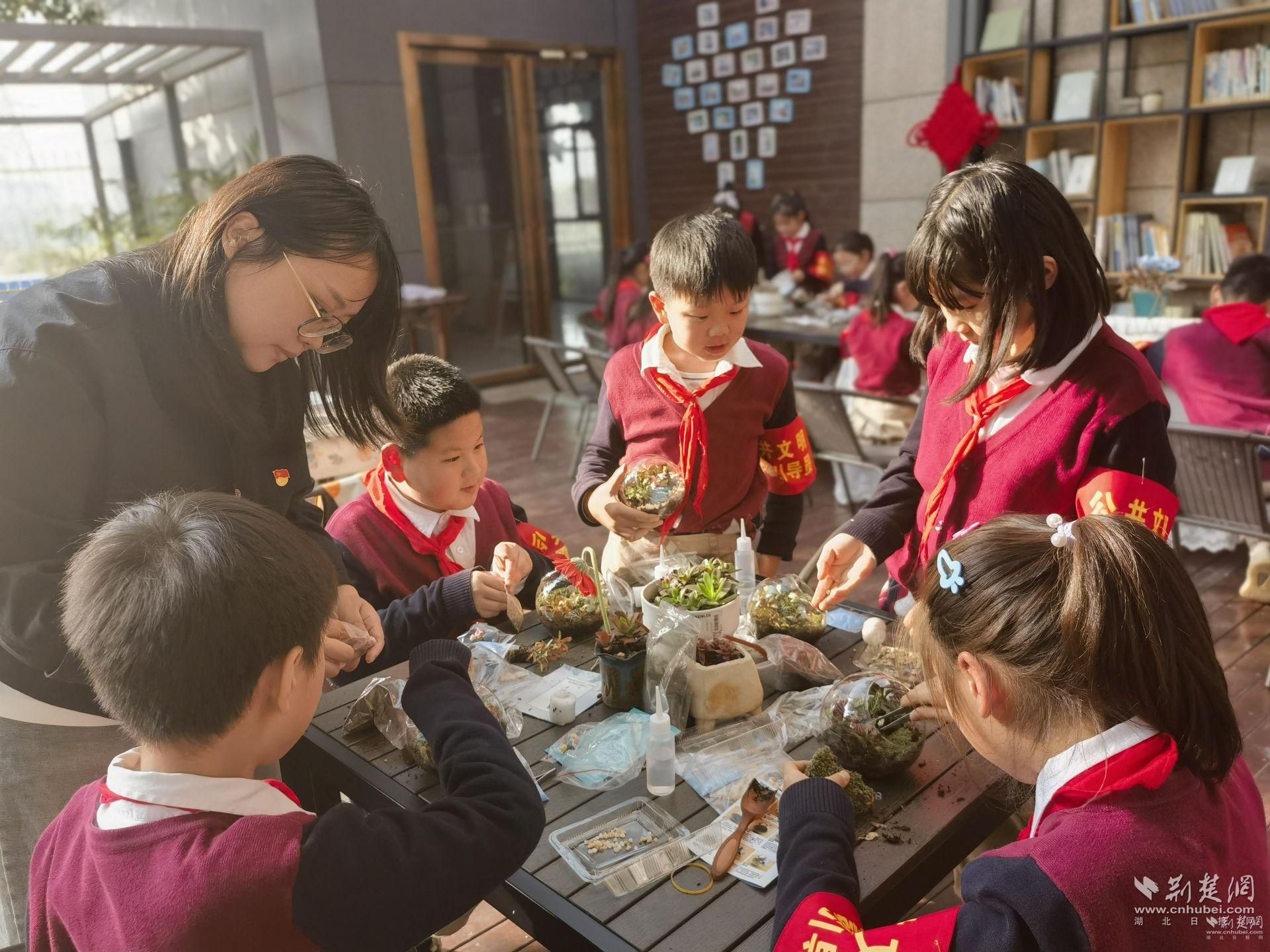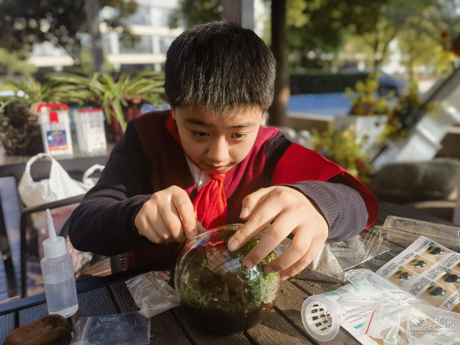 在社工的指导下,学生们将泥土倒入生态瓶内,浇水后用镊子将绿植轻轻夹起放入瓶中。等种完所有绿植后,再将观赏摆件加入到其中,一个妙趣横生、错落有致的微景观生态瓶就呈现在大家面前。“第一次做植物微景观,非常有成就感。老师说要把我们做的植物微景观摆在校园的阳光书吧里,让大家都来参观。我想他们一定会猜是谁做的。”五(3)班朱佳雯同学骄傲地说。