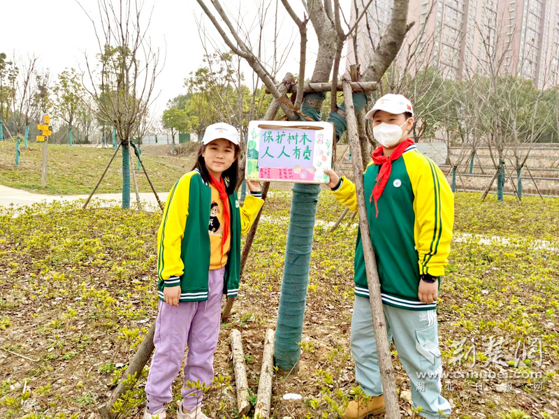 少先队员们还提前制作了主题树牌,带到张公堤上,将它挂在自己认养的小树上,并为小树清理周围的垃圾,让小树更加茁壮成长。