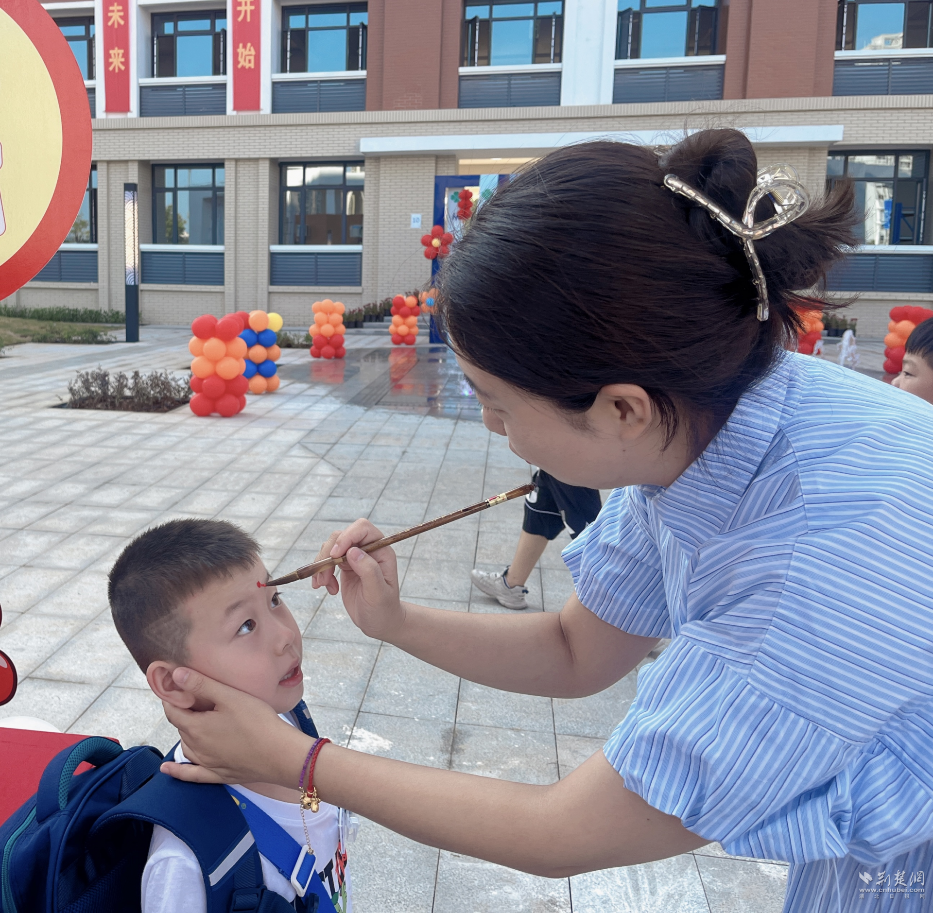 校领导和老师们在校门口为一年级新生进行“朱砂启智,目明心亮”的入校仪式。希望同学们在日后的学习中能目明心亮、一点就通。