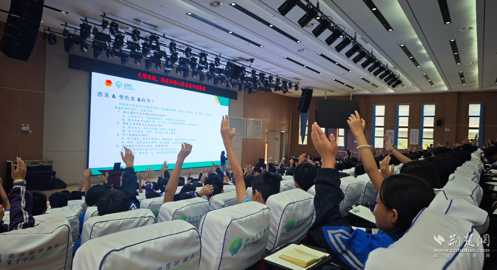 荆楚网(湖北日报网)讯(记者林杉 通讯员李飞)“在人际交往中,我们常常忘了最强大的工具就是我们自己的声音和表达。”9月25日,一场以“文明沟通 构建和谐人际关系”为主题的心理讲座,让汉南区育才中学的校园里充满了欢声笑语与真诚的互动。共青团武汉市委“12355关注成长”系列活动在此举行,国家二级心理咨询师戴小红老师为学生们带来了一堂别开生面的心理课,引导他们在亲身体验中领悟沟通的艺术。