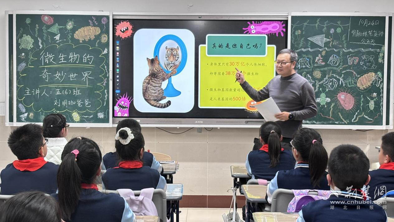 荆楚网(湖北日报网)讯(记者林杉)10月24日,湖北工业大学刘华曦博士走进武昌水果湖二小五年级(6)班课堂,以“微生物的奇妙世界”为主题,为学生们带来了一堂生动的科普课。此次活动是该校“家长进课堂”系列活动的组成部分。