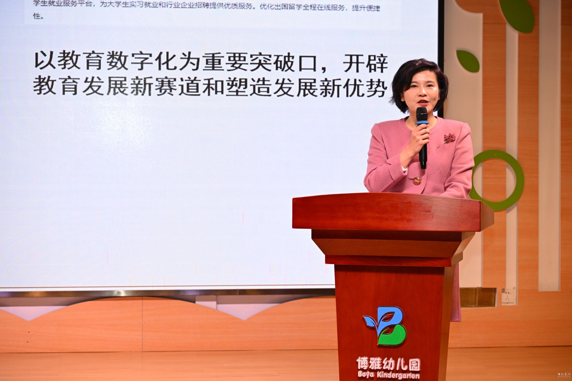市教科院学前教育负责人张敏充分肯定本次活动成效。她谈道:“博雅幼儿园将信息技术与幼儿一日生活有机融合,构建起智能化、个性化的教育生态,助力幼儿身心全面和谐成长。其亮点集中体现在四方面:一是技术赋能生活场域,创造教育新体系;二是课程资源虚实结合,建构教学新样态;三是家园共育资源共享,重塑互动新格局;四是数智赋能教研活动,营造发展新生态。这些实践探索为全市幼教创新提供了鲜活样本。”