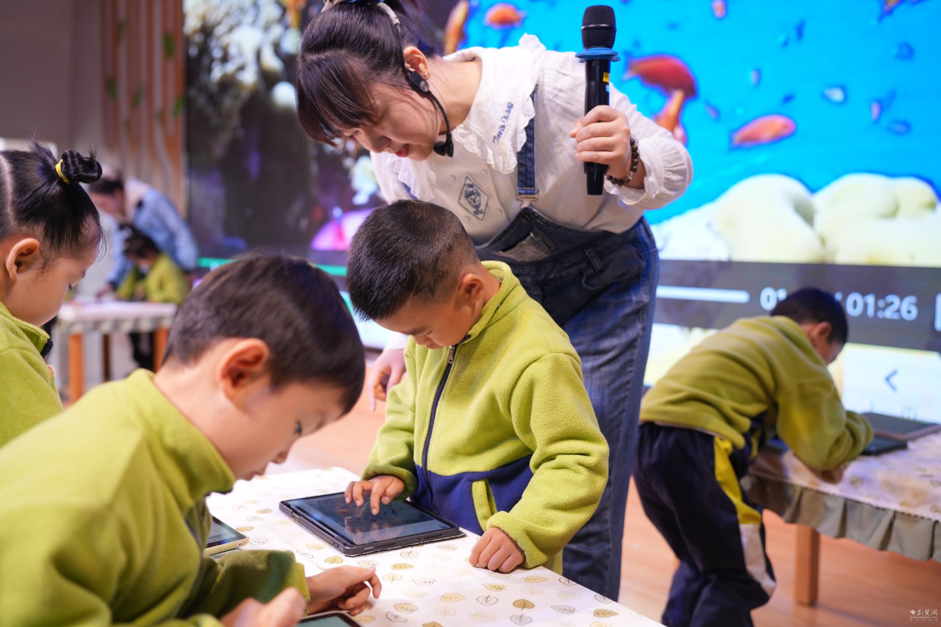教学展示环节,博雅幼儿园吴偲老师带来的中班艺术活动《鱼儿奇妙游》,生动诠释科技与幼教的创新融合。学生们先用平板电脑自由创作线条灵动、色彩缤纷的小鱼,再通过3D扫描技术,亲眼见证自己的作品“游”进投影幕布上的海底世界。现场惊呼声与欢笑声此起彼伏,科技的“魔法”不仅让艺术创作更具趣味,更点燃学生们的想象力与创造力,充分展现 “做中学、玩中学”的教育理念。