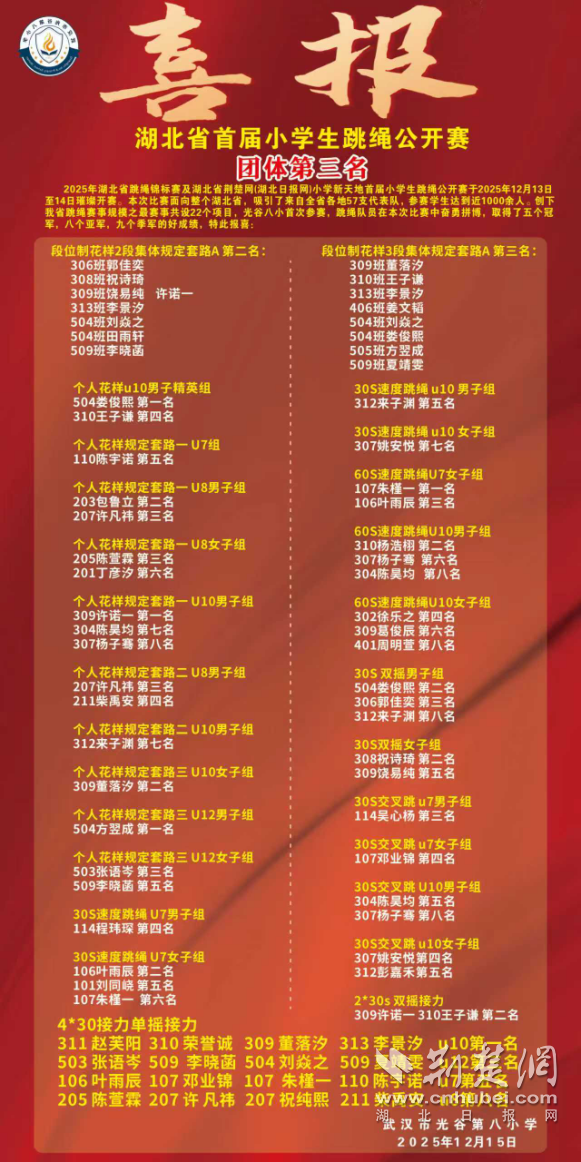 荆楚网(湖北日报网)讯(记者林杉 实习生严呈欣)近日,武汉市光谷第八小学跳绳队在湖北省跳绳公开赛、锦标赛等赛事中捷报频传,首次参赛便斩获团体第三名,将五个冠军、八个亚军、九个季军收入囊中。战绩背后,有体育教师吕京仑的匠心培育,更离不开光谷八小这片体教融合的沃土滋养。