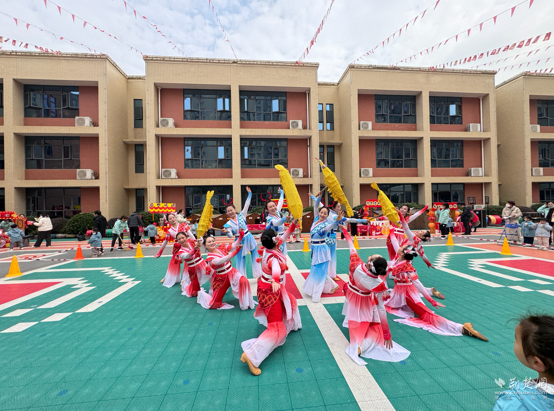 非遗文化体验成为活动亮点。操场上,蔡甸区文化馆带来的楚剧《夫妻观灯》吸引众多家庭驻足,家长跟随节奏拍手,孩子模仿演员动作摇摆。非遗舞蹈“五虾闹鲇”表演时,14名表演者操控彩虾与鲇鱼道具穿梭嬉戏,孩子们目不转睛,与家长一同鼓掌。