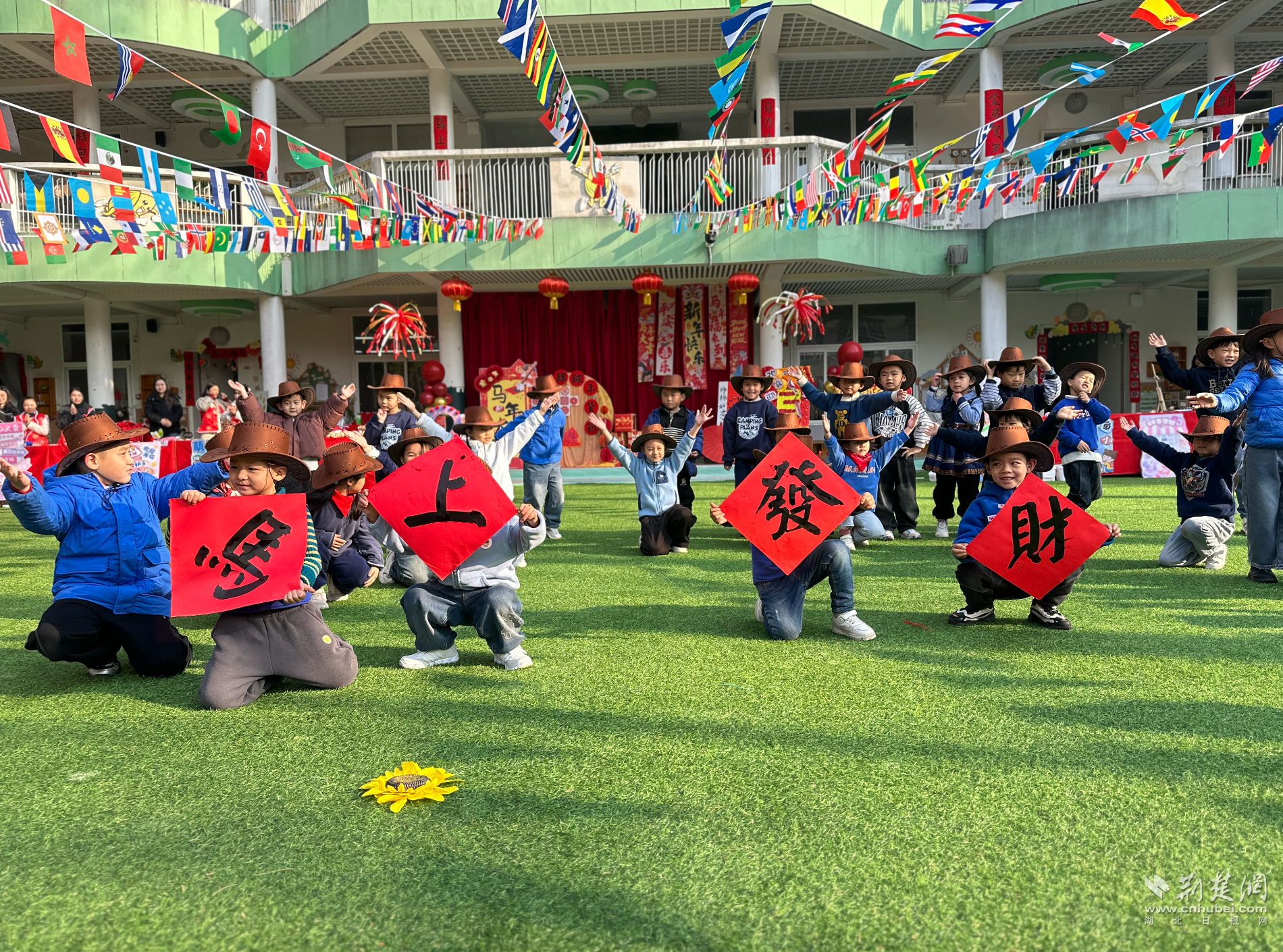 没有预设的表演流程,音乐响起,孩子们便随性起舞。当《圆圈舞》乐声传来,纱帽山幼儿园的孩子们主动走向受邀前来的武汉爱莎学校中外幼儿与外教,伸出手大方邀请,众人围成圆圈欢快共舞。随后,《牛仔很忙》的节奏与非洲鼓点《Waka Waka》相继响起,萌趣的走秀伴着模拟的“印第安的鼓声”,多元文化在这里成为孩子们自由组合、快乐共响的彩色音符。