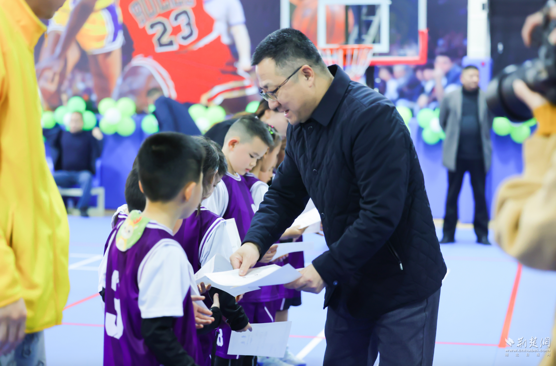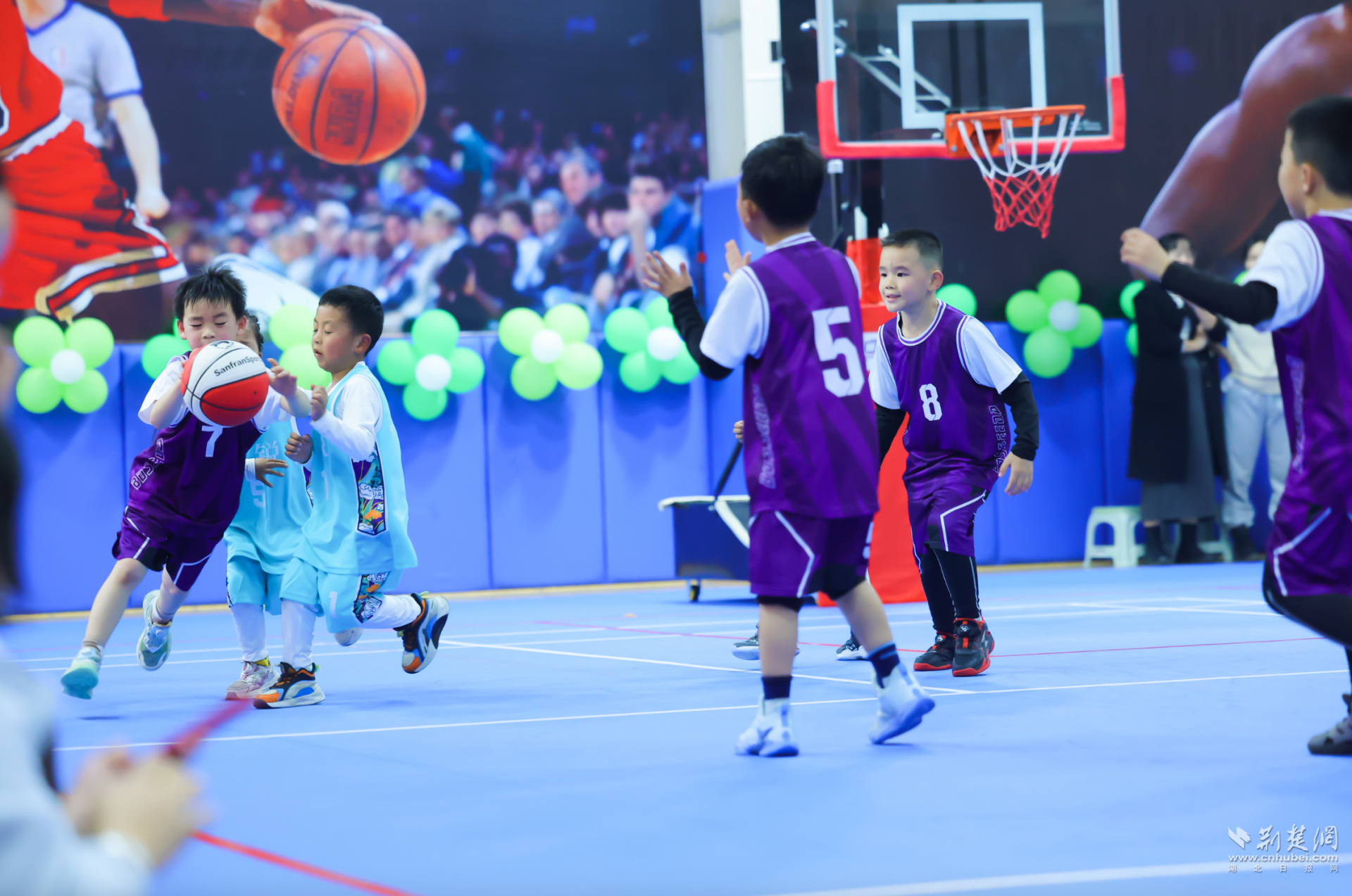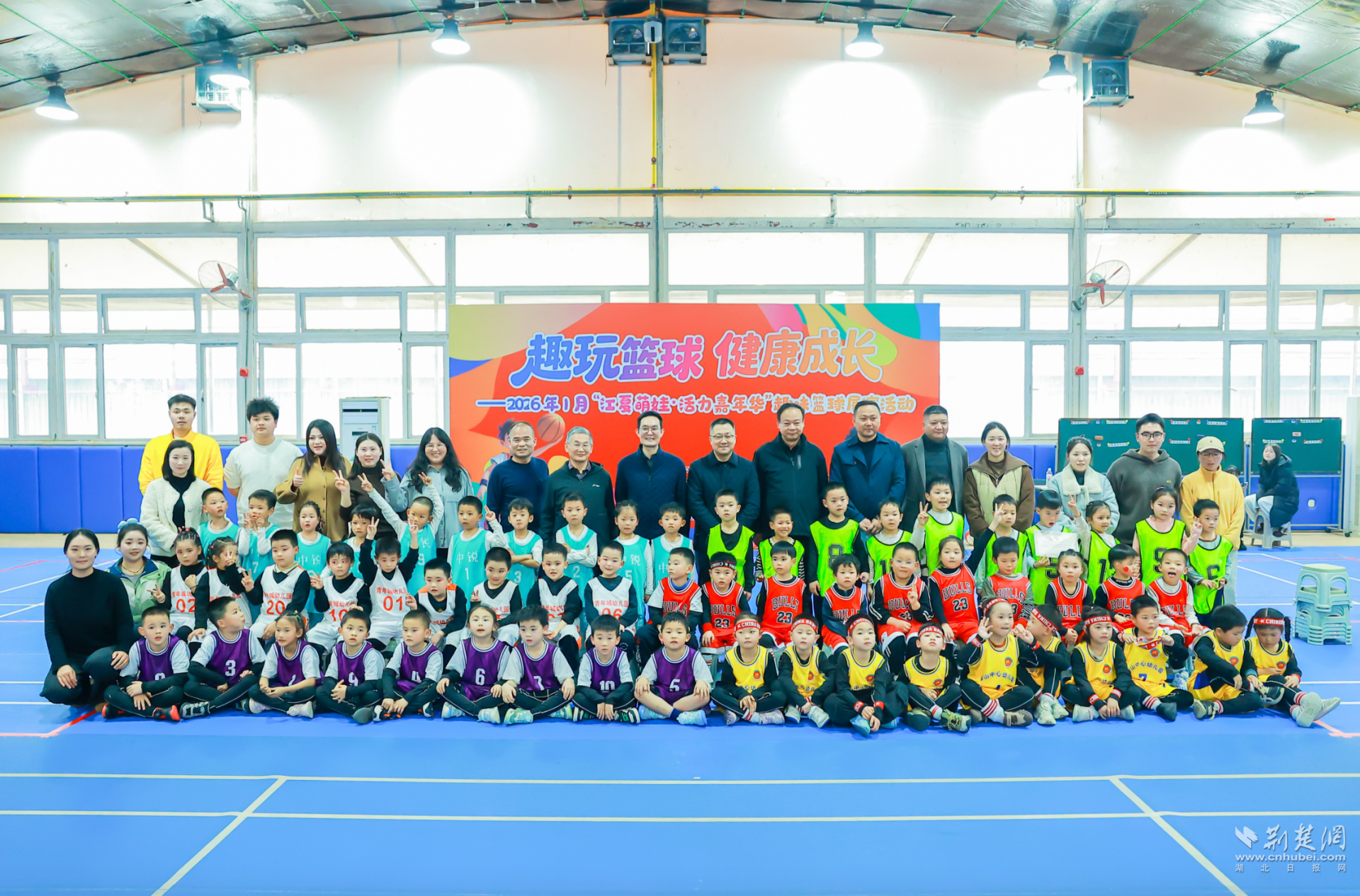 荆楚网(湖北日报网)讯(记者林杉 通讯员李斯亚)1月16日下午,动感音乐在江夏区庙山滨湖美加幼儿园响起,6所幼儿园的大班幼儿身着运动装,精神抖擞地步入球场。2025年“江夏萌娃·活力嘉年华”趣味篮球展演活动在此开展,孩子们在球场上运球、传球、尝试投篮,每一次协作和投篮都引来场边阵阵掌声。