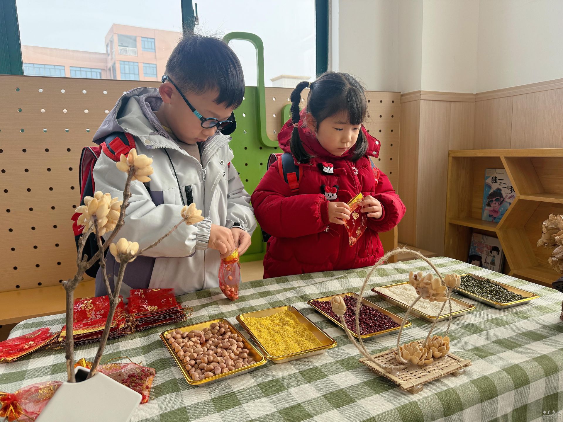 园内新年氛围浓厚,温馨喜庆的布置饱含着老师们对孩子们的关爱。福气上上签,幼儿体会到抽签的快乐,感受生活中的小惊喜;喜集百福米,幼儿用福袋收集五谷的同时,寄托平安健康的美好愿景;福字拓印画,孩子们亲手印出各式各样的福字,感受传统文化的独特魅力。