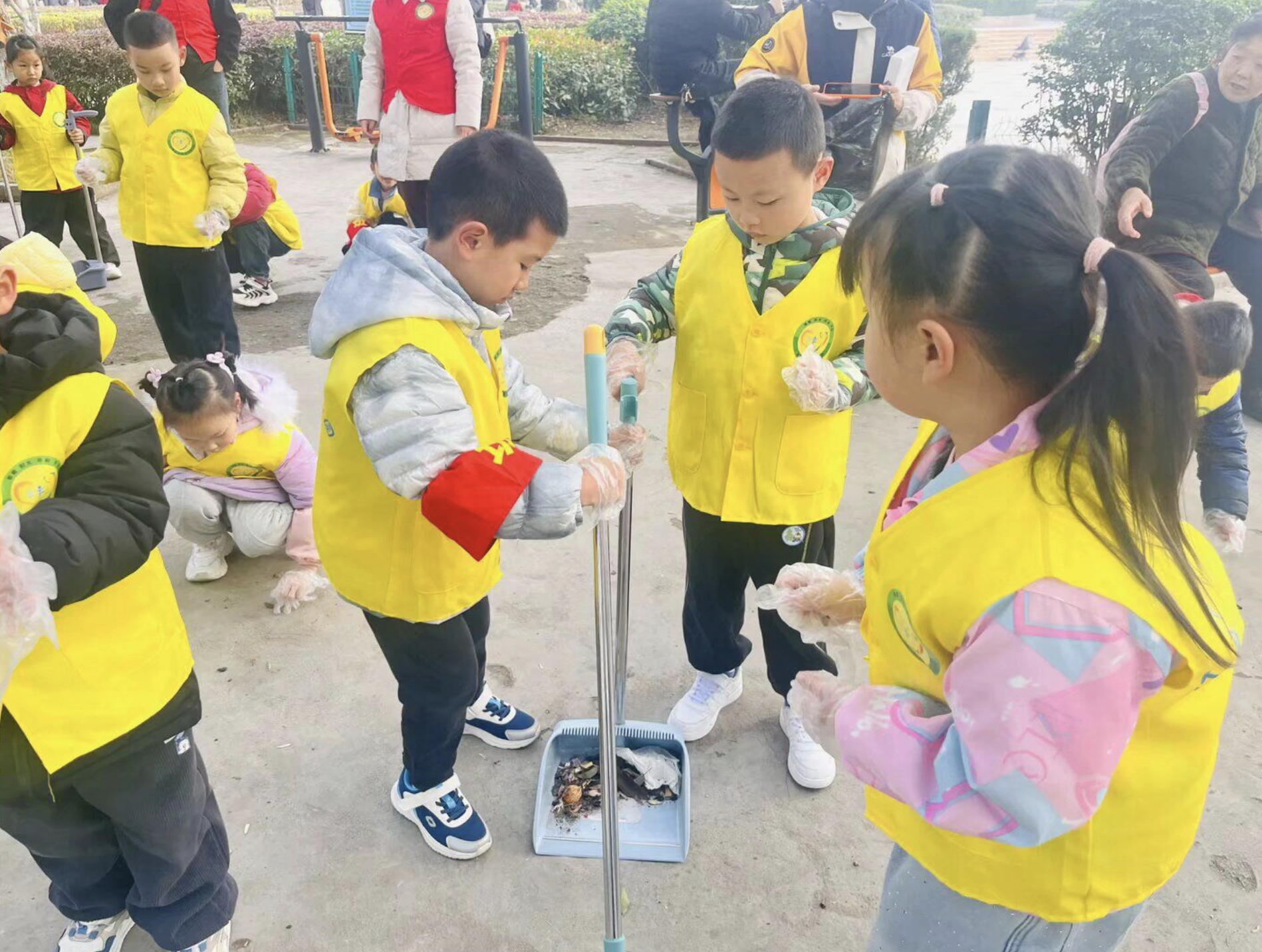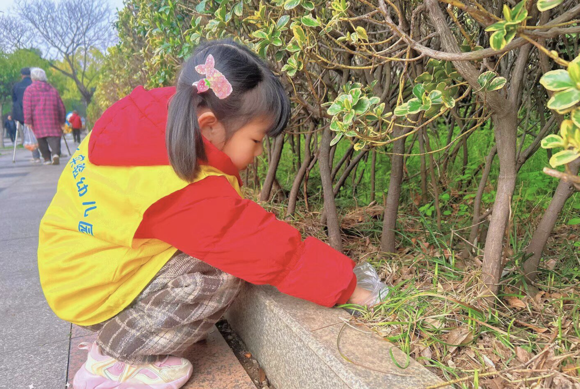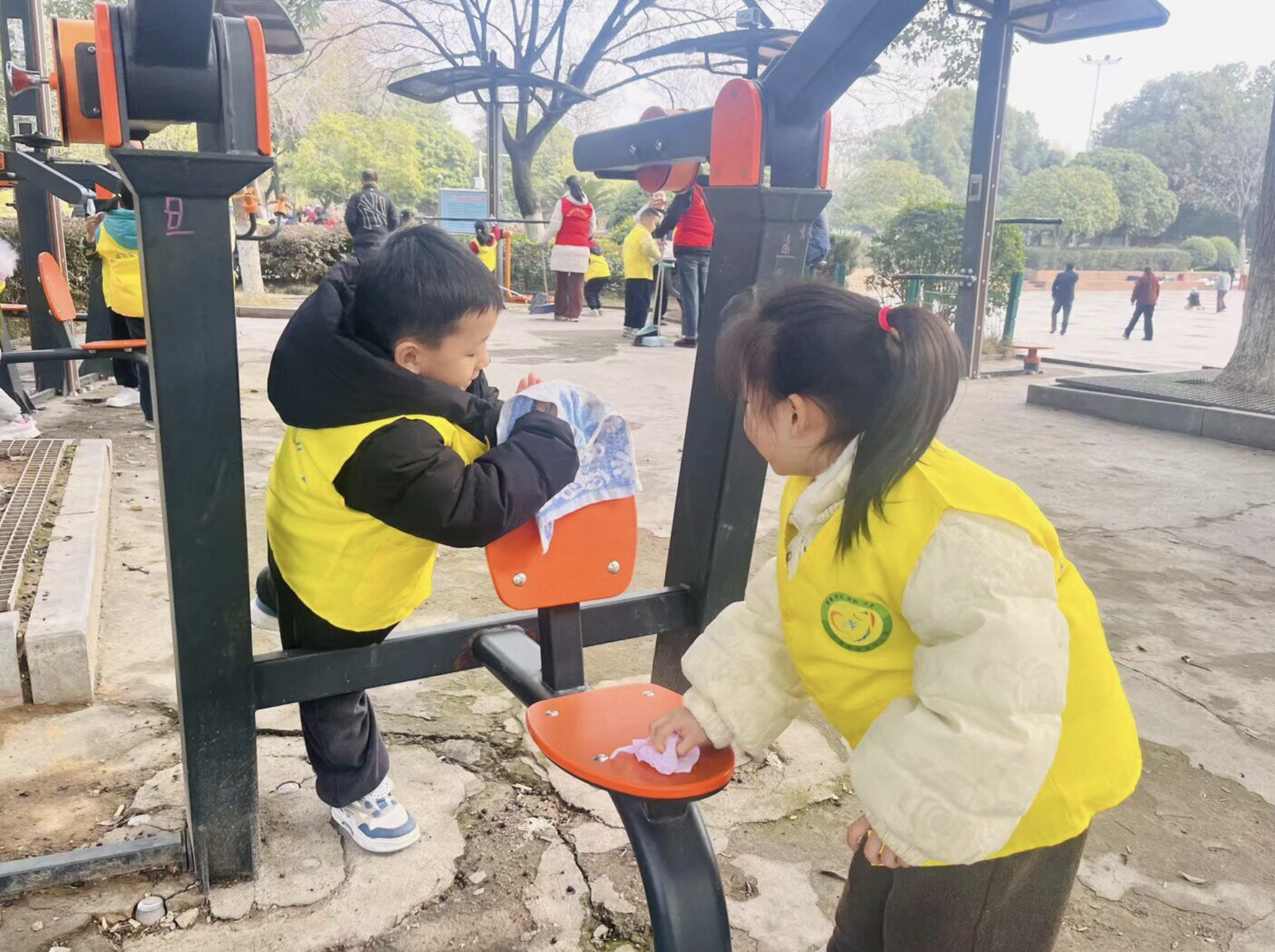 江夏区实验幼儿园一园两区联合花山学府小区物业、北华社区开展的学雷锋活动。孩子们分工协作,有的仔细擦拭健身器材的每一个部位,有的蹲下身捡拾砖缝里的烟头,有的钻进绿化带清理隐藏的塑料袋。一位正在锻炼的居民停下脚步,看着孩子们认真的样子,竖起了大拇指。