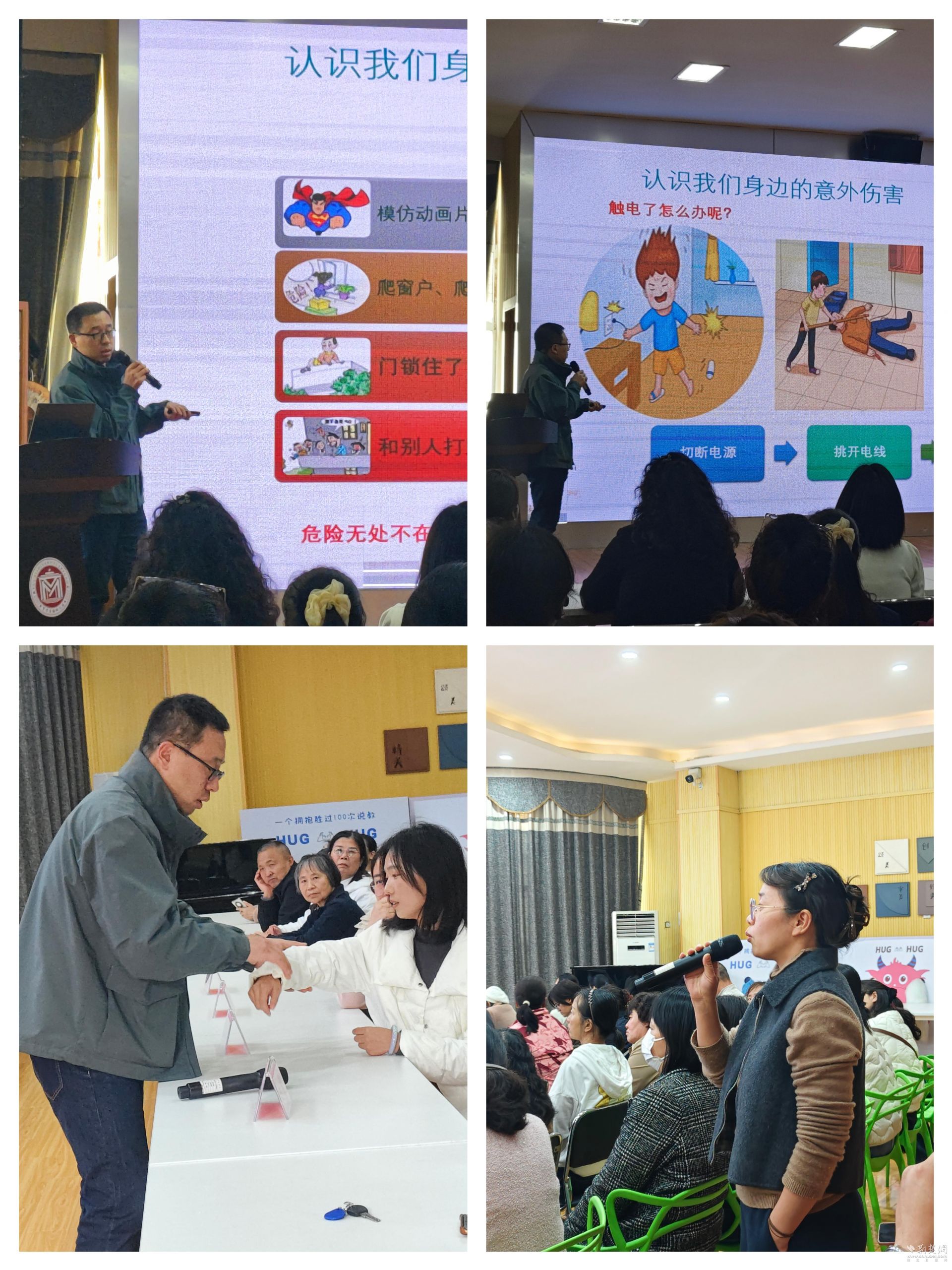 讲座现场,孟喜军医生结合意外伤害的常见原因及多年临床经验,用生动的案例、图文并茂的课件,详细讲解了幼儿跌倒、溺水、烧烫伤、宠物抓伤等常见意外伤害的预防要点与应急处理流程。讲解了海姆立克急救法、创伤包扎、骨折初步固定等实操技能等,手把手指导家长规范操作手法,确保在意外发生时能第一时间科学施救。