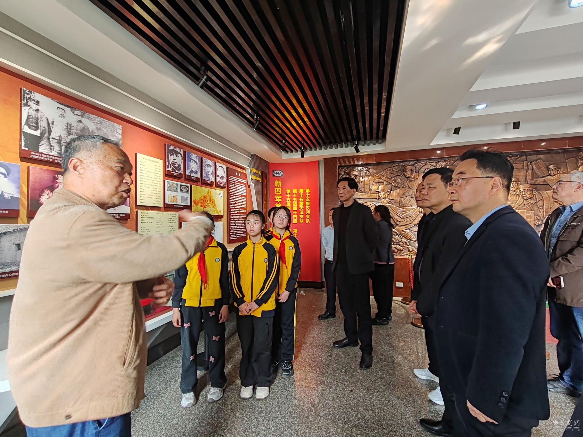 仪式结束后,全体人员在侏儒山抗战纪念馆馆长付建桥的带领下参观纪念馆。通过付建桥的讲述和馆内陈列的历史文物,大家重温了那段历史。付建桥的父亲傅玉和,当年是新四军第五师第15旅的侦察参谋兼手枪队队长。在侏儒山战役前,傅玉和乔装成看风水的道士,潜入伪军司令部,通过内线成功获取日军中原地区军用地图和武汉地区兵力布置图,还获取了敌军口令,为战役打响第一枪奠定了基础。