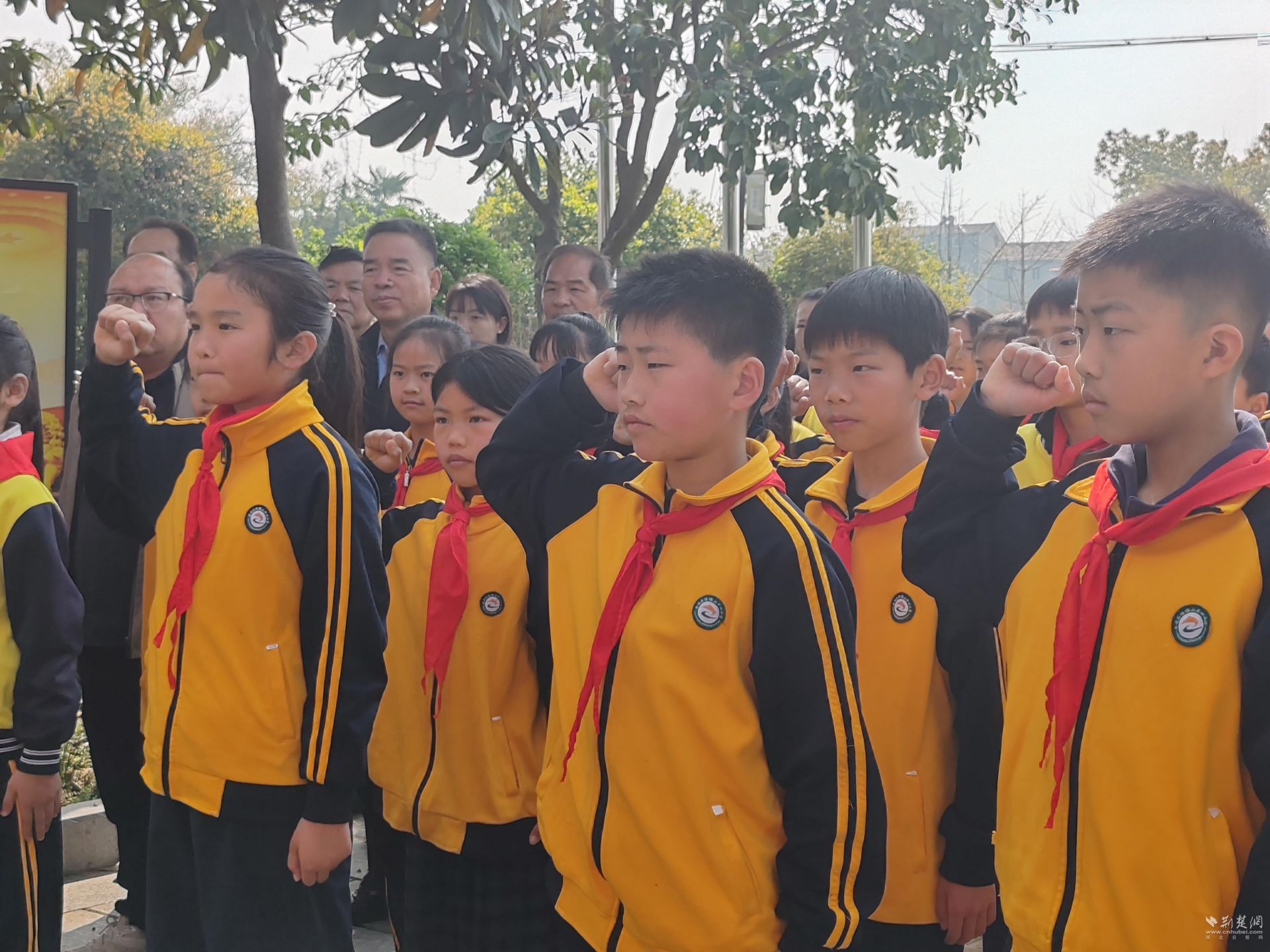 启动仪式在《中国少年先锋队队歌》声中开始,侏儒山中心小学师生齐声合唱。少先队员代表尹佳慧走上台,她是学校四(2)班的“小红娃”志愿者。“每次路过校园的宣传栏,‘侏儒山战役’那几幅画面总让我停下脚步,”她说,“冬天的寒风刮得脸生疼,泥地里的水冻得脚发麻,可面对敌人的枪炮,他们没有后退一步。”她向在场的同学发出倡议:带着英雄的精神,做新时代的“小红娃”,做最好的自己!在少先队代表宣誓环节,孩子们高举右拳,许下传承红色血脉的承诺。