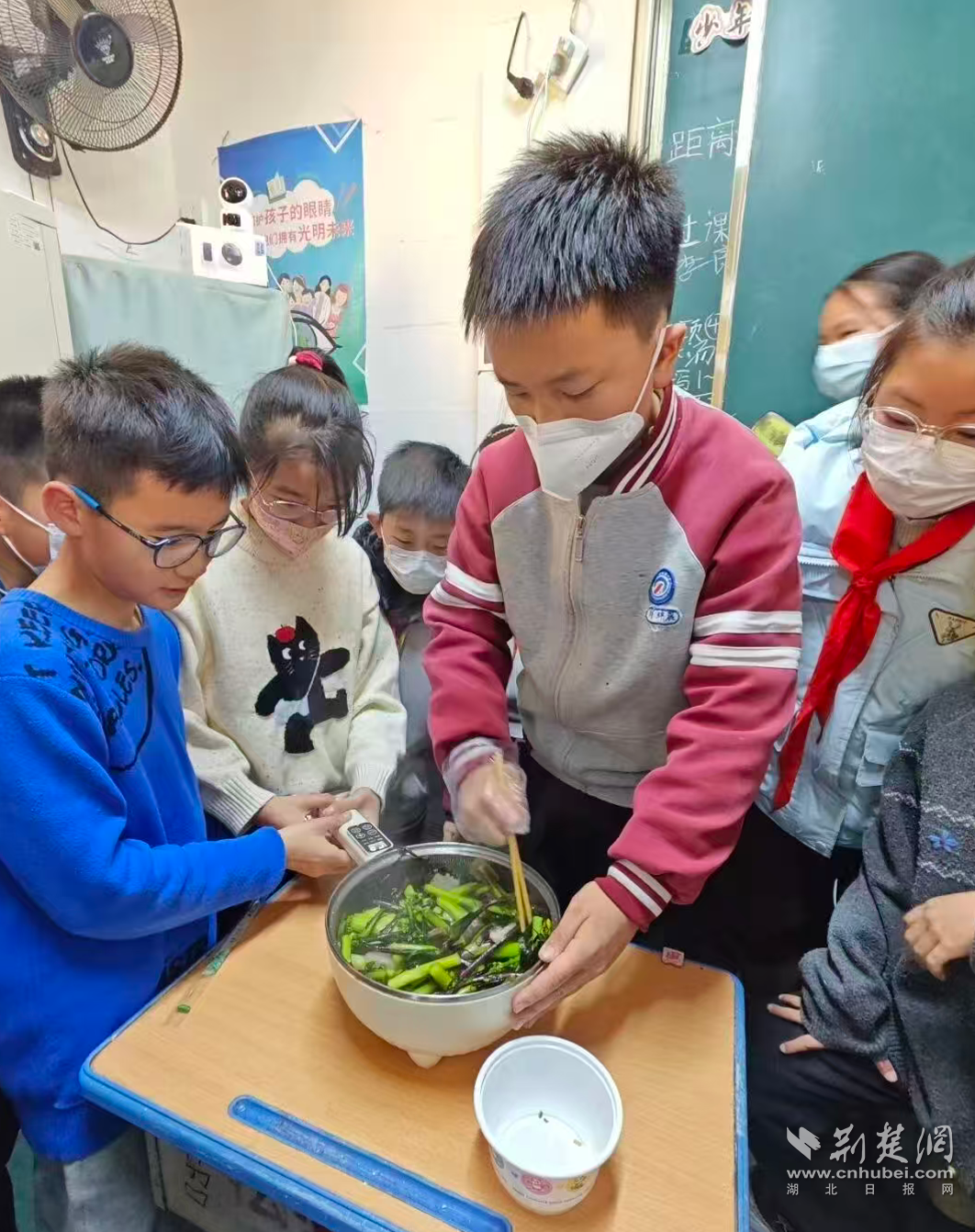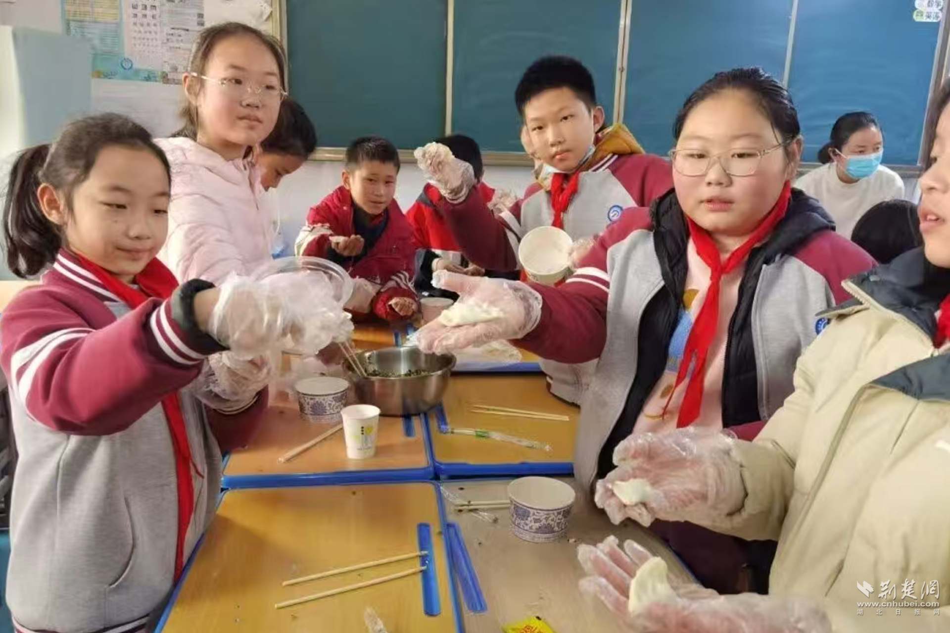 “腊肉炒白菜苔是武汉人春天最爱的一道菜,菜苔的清甜配上腊肉的咸香,味道好极了!”五年级的“小厨师”肖玮晨一边翻炒着锅里的菜,一边向同学们介绍。六年级的同学则专注地包着饺子,他们将切碎的大白菜和包菜拌上肉馅,熟练地捏出一个个元宝似的饺子。不一会儿,热气腾腾的菜肴和饺子端上了桌,大家围坐在一起,品尝着自己的劳动成果,脸上洋溢着满足的笑容。