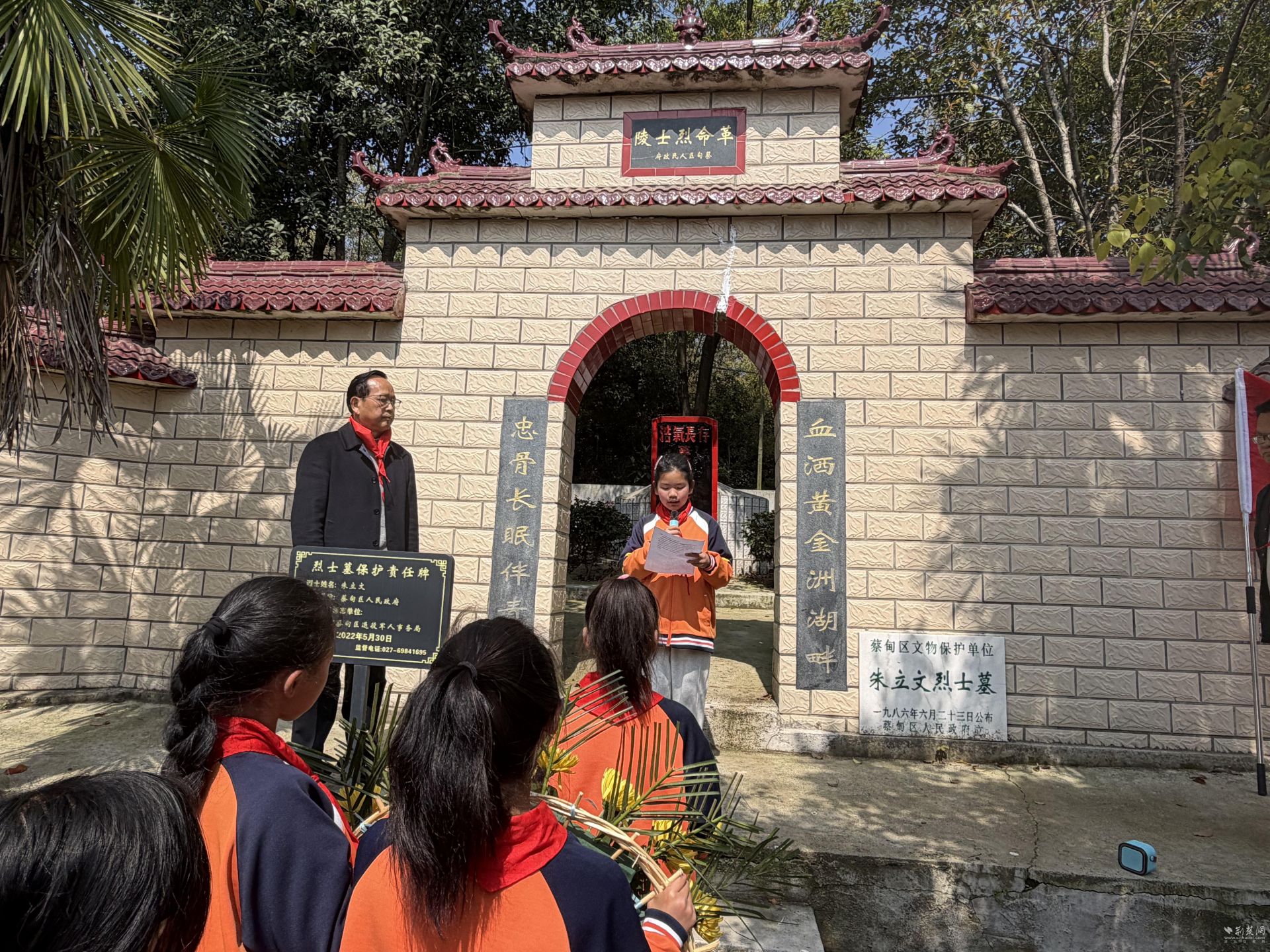 馆内学习结束后,师生们前往傅玉和与张环芝烈士墓开展祭扫活动。学生们认真清理墓区落叶、整理仪容。教师代表敬献花篮、默哀追思,32名学生依次献上小白花。学生们庄严宣誓“铭记英烈功绩,传承红色精神,努力学习,报效祖国”,铮铮誓言彰显传承红色基因的坚定决心。宣誓后,学生们自由瞻仰烈士墓,轻声分享感悟。