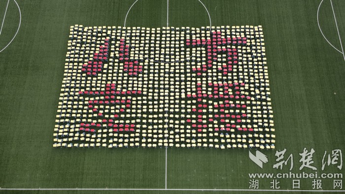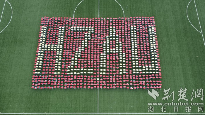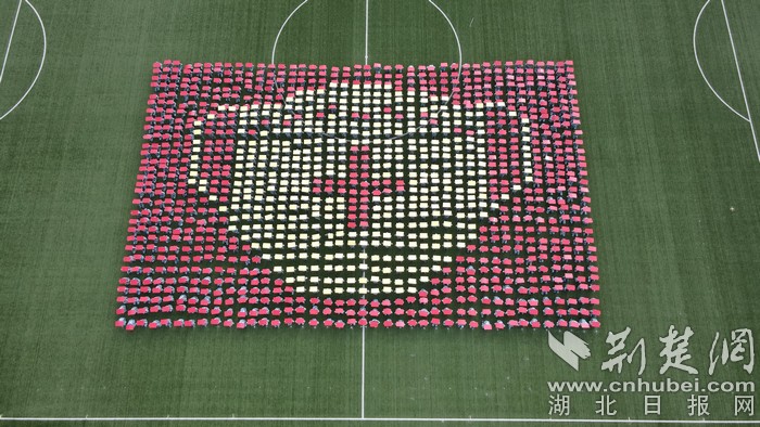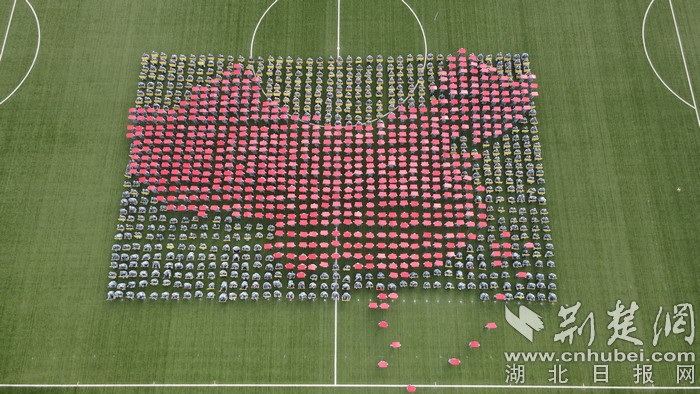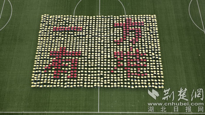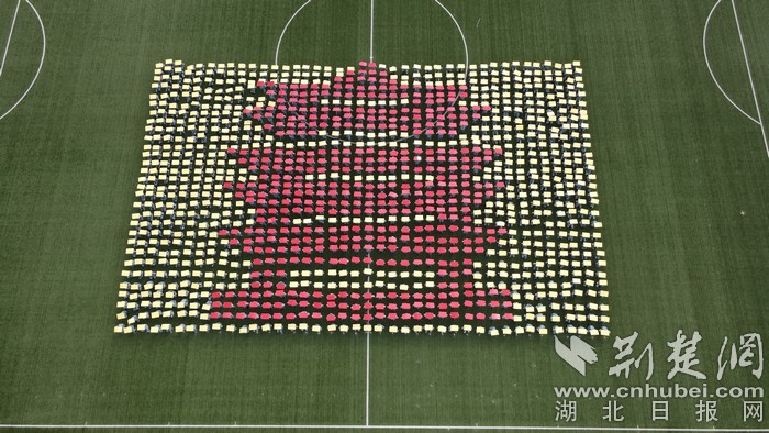 接着,在学生洪亮的“生命至上,举国同心,舍生忘死,尊重科学,命运与共”口号声中,他们变换出“黄鹤楼”“口罩”“爱心”“医生”“药瓶”“握手”等全国人民战“疫”元素图案,致敬在疫情中挺身而出、无私奉献的逆行者们。