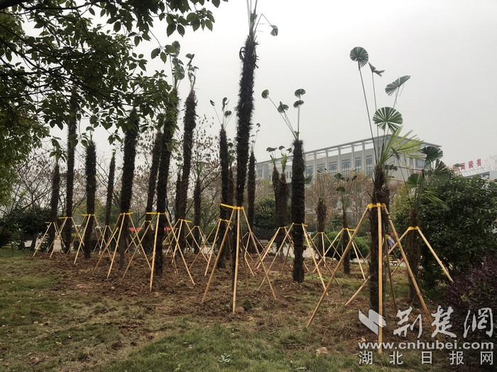 经过大家两个多小时的默契配合,一批楠竹、棕榈树、冬青、桂花树、樟树、枇杷树在校园内和鄢家湖边迎风挺立,格外引人注目。