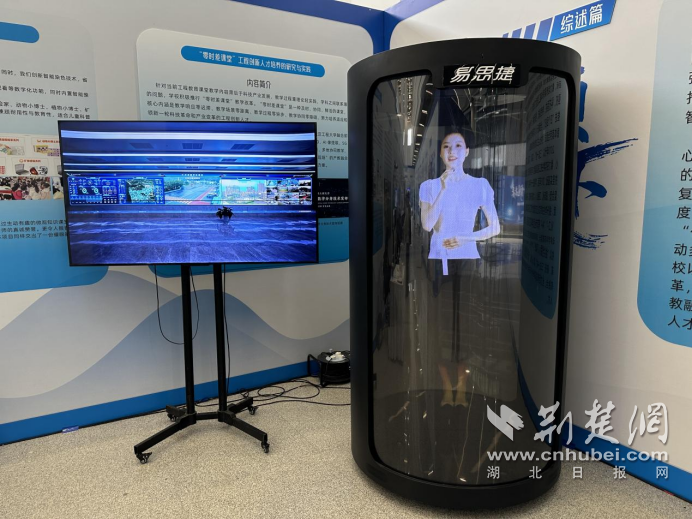 从人工智能进课堂,到具身智能走出实验室,高校如何让技术真正服务于产业?展览上,“零时差课堂”的实景展示尤为亮眼。映入眼帘的“远端全息仓”里,站立着武汉工程大学兴发矿业学院王耀眉老师的“数字分身”,展示的是她在宜昌兴发集团现场,为大家介绍目前亚洲最大室内单块屏的真实教学场景。