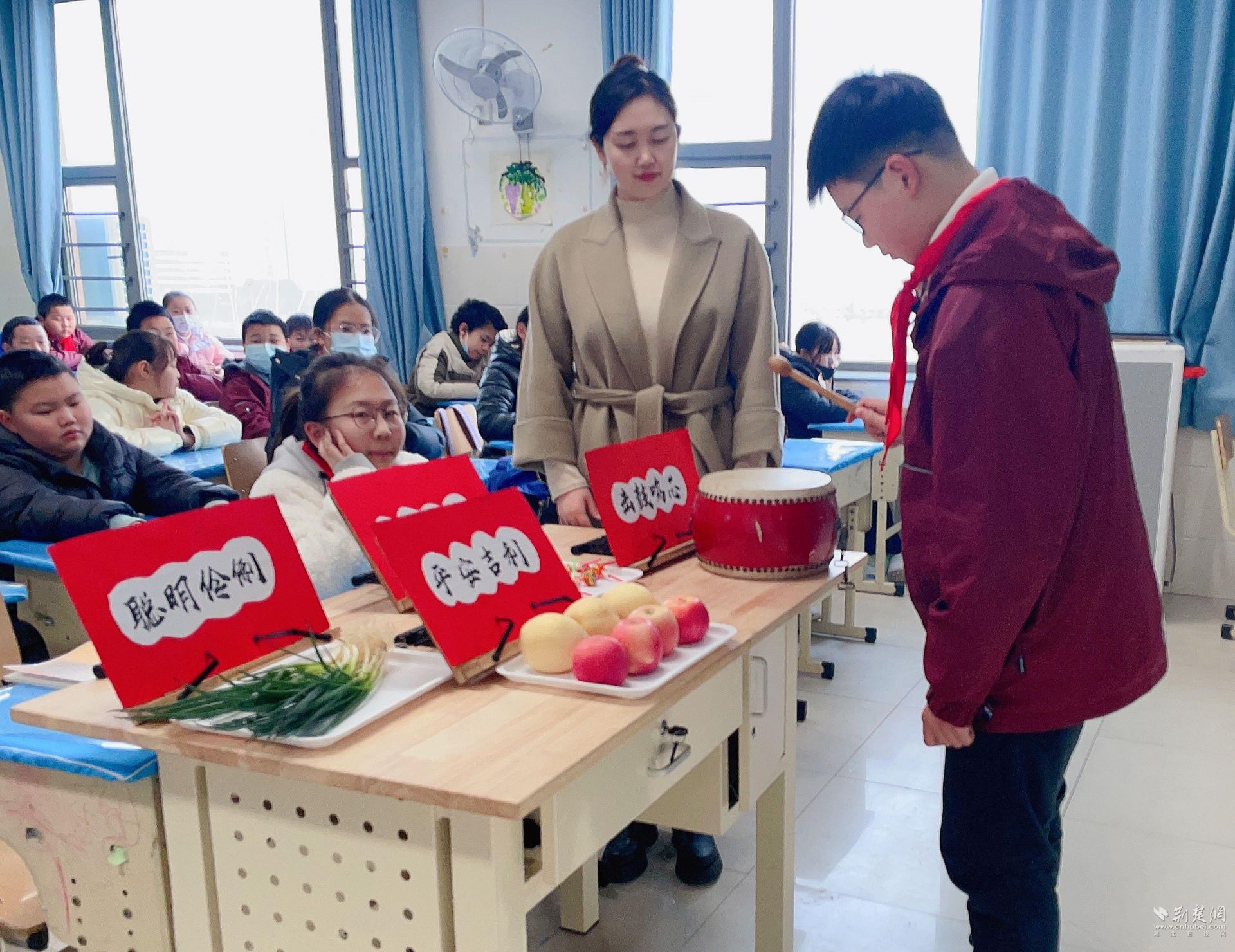 王丽娜邀请一位学生上来进行“报到仪式”——一摸葱,祝愿聪明伶俐;二摸苹果,祝愿平安吉利;三摸棒棒糖,祝愿身体棒棒;四击鼓,新学期明志鼓气。