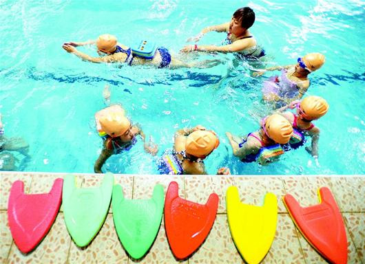 湖北日报讯 今年武汉启动游泳进课堂试点行动,将投入3000万元,让43所试点学校的1万名小学生学会游泳。图为昨日沈阳路小学四年级学生在恒温游泳馆学游泳。(记者 倪娜 视界网 乐钢 摄)