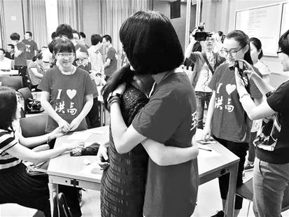 原来,这是高考前的一次特殊班会——亲情测试。向斌武让每位同学先写出五个最爱的人,并阐明理由;接着让大家将这五人一一划去,从中体验失去亲人的感受。结果是同学们划起来远比写下来困难得多。“当我不得不把妈妈划掉的时候,心里特别难受,好像就划去了那弥足珍贵,无微不至的伟大的母爱,以后的日子没法过了。”学生吴一涵说,自己前几天还因为母亲批评她玩电脑的时间长,而跟她吵架,特别生气,但这一刻,她突然觉得自己跟妈妈吵架太过分了。活动结束时,她跟到场的妈妈来了个深情的拥抱(如图)。