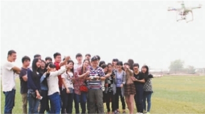 在杜平指导下,现场一些学生尝试操控了无人机。“无人机应用比较广泛,而且新颖,很多好莱坞大片的一些镜头都是运用无人机航拍,学生掌握无人机的操控和运用技巧对今后就业也有好处”。杜平说完后还利用无人机拍摄了班级集体照进行点名。