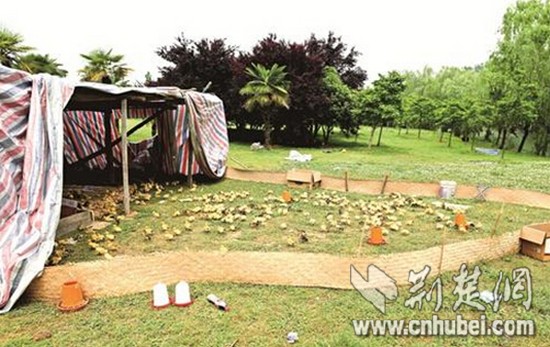 楚天都市报讯(记者满达)“东九楼前的草坪上,居然有人养起了鸭。”“这是要搞农家乐的节奏吗?”这两天,华中科技大学的不少学生看到眼前的一幕,纷纷议论开了。原来,该校东九教学楼前的一块绿地,被人用铁丝网圈了起来,又搭起棚子竟养了200多只小鸭子。
