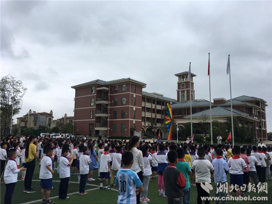 湖北日报网消息(通讯员 王学斌、余张鑫、秦腊)2017年9月1日上午,正式更名后的武汉市光谷第二十六小学迎来2017-2018学年上学期开学典礼。全校近700名师生齐聚学校操场,以崭新的姿态迎接新学期的到来。虽然浓云深沉,但整齐的脚步声划破黎明,响彻在花山碧桂园绿意盎然的操场上。