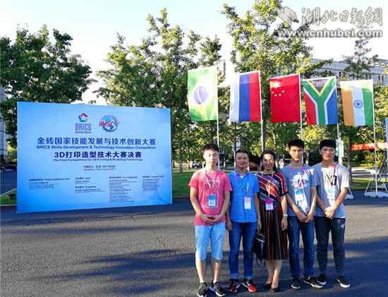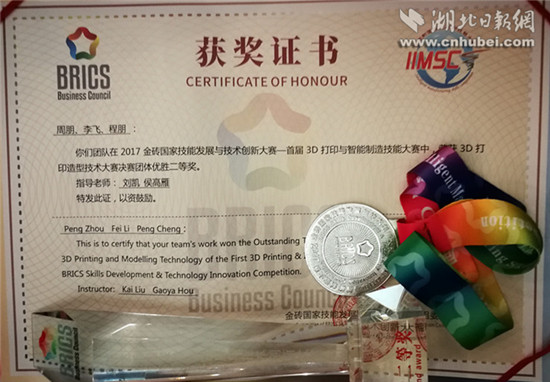 2017年8月22日至26日,“金砖国家技术技能发展与技术创新大赛首届3D打印造型技术决赛”在杭州职业技术学院举行,由武汉职业技术学院机电工程学院刘凯、侯高雁老师指导,周朋、李飞 、程朋同学组成的武汉职业技术学院代表队获决赛团体二等奖,其中在原创作品设计、数字化设计与成型两个阶段斩获原创作品二等奖、三等奖各一项,刘凯、侯高雁老师荣获“优秀指导教师”称号,学校获“最佳文明奖单位”。