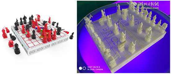 武职二等奖原创作品的设计灵感是来源于时间和空间的有机结合,让抽象的时间体现到具象的绿叶成长。三等奖作品《中国象棋》则将蕴含我国民族文化精髓的中国象棋与现代设计方法、以3D打印为代表的先进制造技术完美结合,棋盘表面中间是此次金砖国际赛的LOGO,边缘、四周及内部花纹处处体现了中国文化,棋子设计取材于古代,历史悠远,风云再现,一切就在方寸之间,富有创意,切合大赛主题,受到好评。