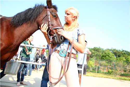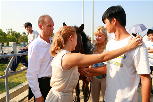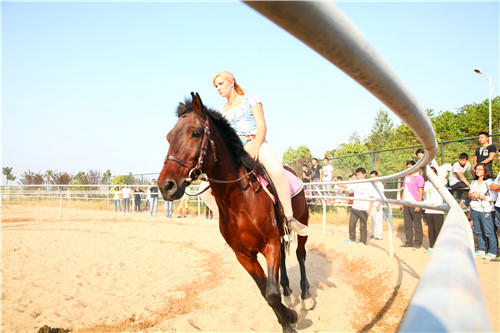 两位女骑士还现场展示了骑术。她们利落地纵身跃上马背,握紧缰绳,奔驰在马场上。随着口中向马发出各种号令,马儿有节奏地变动着步伐,时快时慢,卧倒、起身……丝毫看不去她们也是刚刚与学校马房的马才“相识”的,其驯马技艺受到中国大学生的啧啧称赞。