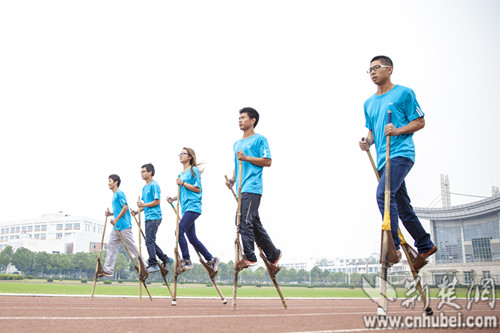 10月17日下午,在该校体育场见到了这些大学生“高人”,双手各持一米多高的竹竿,脚上绑着护膝,手上戴着白手套,双脚踏蹬大步向前。