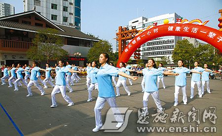 8月8日上午,来自省、州属医疗卫生单位的职工正在进行广播体操比赛。当天上午,2012年恩施州“全民健身日”活动启动仪式暨省、州属医疗卫生单位第九套广播体操比赛在州城风雨桥头举行。湖北民院附属民大医院获得此次比赛第一名。在当天的“全民健身日”活动启动仪式上,州文体局组织开展了国民体质监测等活动,当天全州各县市各类公共体育场馆设施也免费向公众开放。记者 朱海剑 实习生 吴俊仪 通讯员 唐见 摄