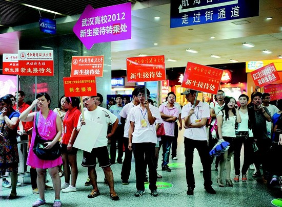 楚天都市报讯 昨日,记者在武昌火车站看到,许多大学已在车站安营扎寨,开始接待新生,火车站也因新生的到来,客流量较平时增加了一倍。车站附近的两个公交站的乘客中,学生占八成。图/记者朱熙勇