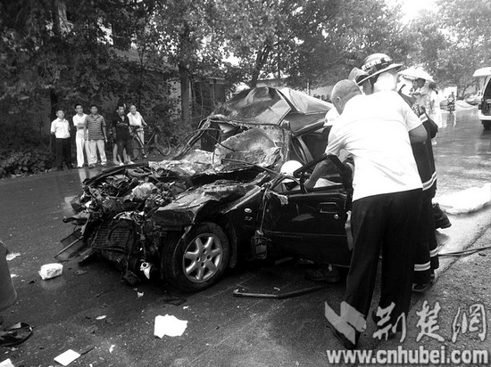 楚天金报讯 昨日下午2时40分,106国道新洲邾城街骆畈村骆家湾路段,一辆由南往北行驶的黑色小轿车,与一辆红色大货车迎面相撞,轿车钻进货车底被紧紧“咬住”。事发后,消防官兵赶至现场全力营救,可惜轿车司机被救出时已停止了呼吸。据目击者称,事故可能与大雨有关。(记者饶纯武 通讯员王东升摄影报道)