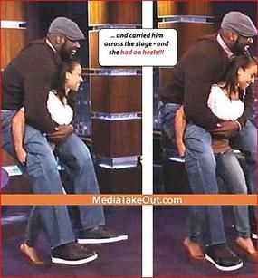 沙奎尔-奥尼尔和女友(此前有消息称两人已经完婚)尼基-亚历山大近日做客吉米-坎莫尔脱口秀节目,节目一开始,两人以一种令人瞠目的方式登场,身高仅1.57米的尼基背着身高2.15米、体重达到300斤的奥胖直接杀到主持人跟前,令现场观众惊讶不已,而且尼基还穿着高跟鞋。事实上早在今年四月份,两人就曾玩出各种高难度动作,看上去尼基根本不像是一名真人秀明星,而像是一名彪悍的杂技演员。