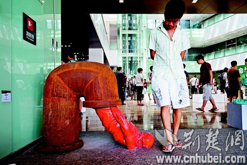 本次展览集中了湖北30余位艺术家的50多件雕塑作品。作品从多个角度反映现实生活中生存的焦虑,个人生存与都市化进程、全球化的关系等。其中,湖北美术馆馆长傅中望的雕塑作品《泡沫城》,形象描述泡沫、废气等充斥于城市周围的景象,引起观者对环境污染现状的思考。项一的作品《涩滞的空间》则让人联想到工业发展与人类生存环境之间的矛盾(如图)。 记者叶茂林摄