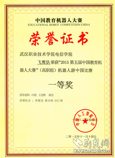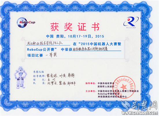 “第五届教育机器人大赛”一等奖、““2015年中国机器人大赛暨Robocup公开赛”助老服务机器人创新挑战赛一等奖、“2015年中国机器人大赛暨Robocup公开赛”助老服务机器人全能挑战赛二等奖、“2015年中国机器人大赛暨Robocup公开赛”助老服务机器人起居环境管理与服务赛项二等奖、“2015年湖北省职业院校技能大赛”电子产品设计与制作高职组三等奖,在刚刚过去的2015年,武汉职业技术学院电信学院学子在国家级和省级专业技能竞赛中屡获佳绩。优异的成绩得益于该院一系列务实的教风学风建设、切实有效的技能培训手段和强有实力的教学团队。
