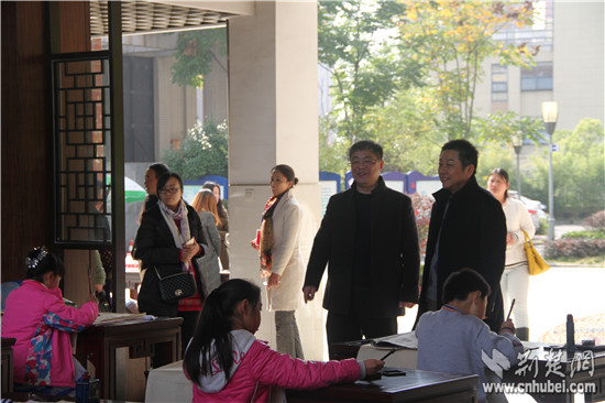 东湖高新区教育文化体育局刘大成书记欣赏光谷九峰一小学生现场书法展示。通讯员 李建设 摄