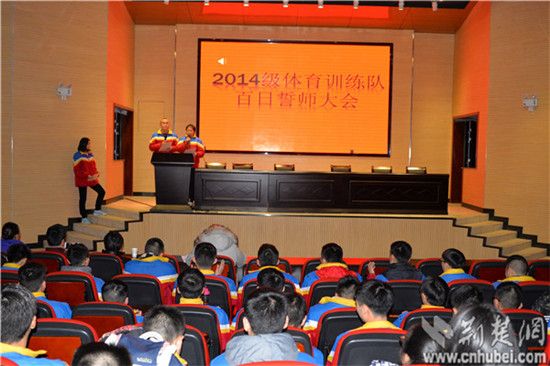 荆楚网消息(通讯员 陈雪萍)1月9日晚上8时50分,华中师大来凤附中部分学子齐聚在校多功能报告厅隆重举行了2017届“决战体考、百日冲刺”誓师大会。校长宋涛、年级组代表周大方主任、总教练田径老师、班主任代表鲁健老师、优秀毕业生黄黎老师出席活动,高三年级全体体育生参加本次会议。大会由四名体育生代表主持。