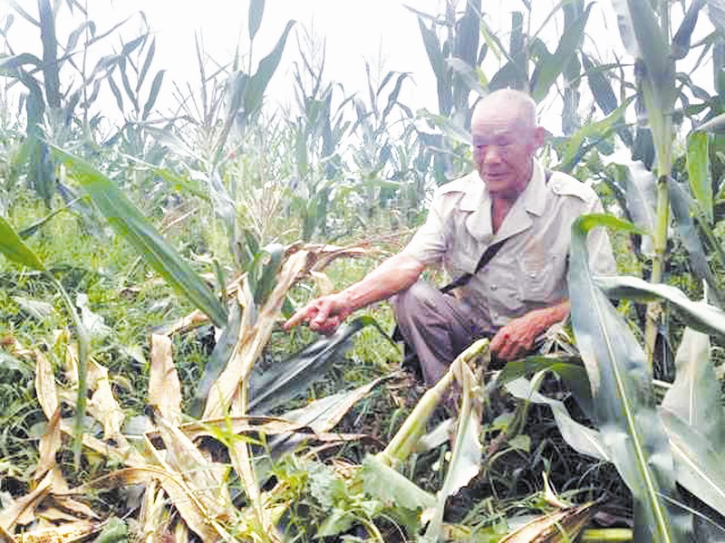 昨日上午9时许,记者在新生活村二组见到,陈爹爹的玉米地处于丘陵地带,附近几乎家家户户种植玉米,地里不仅大片倒伏,而且地上还有啃过的玉米棒子,泥土上可清晰地看见猪蹄的脚印。