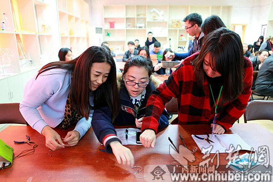 记者们都饶有兴趣地制作着铁丝陀螺。图片来自广西新闻网