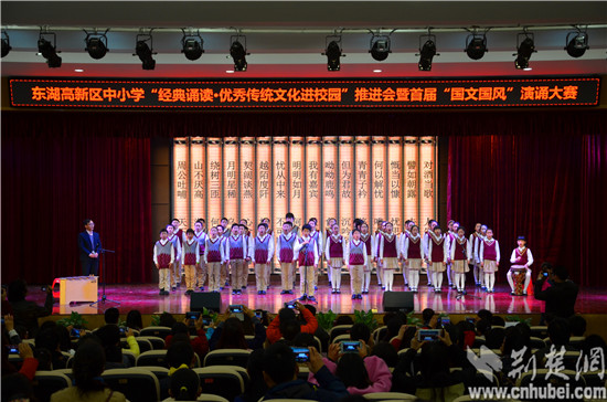 荆楚网消息(记者 陈敏 通讯员 周蕾、赵华军、王彩霞)11月14日上午,武汉市光谷第一小学多功能报告厅里人声鼎沸、诗意流淌,东湖高新区中小学“经典诵读·优秀传统文化进校园”推进会暨首届“国文国风”演诵大赛的复赛在这里隆重举行。