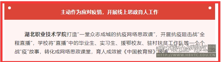 链接:《中国教育报》刊载文章《一堂众志成城的抗疫网络思政课——湖北职业技术学院“抗疫育人”侧记》https://mp.weixin.qq.com/s/5btDpkx3Jk4hAtVIt0fO8Q