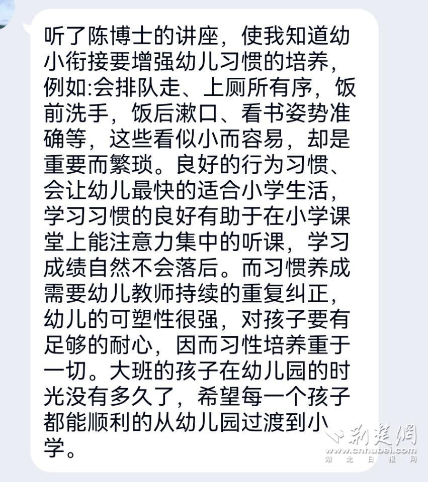 听完本次讲座,家长们和老师们也都有很深的感悟。大二班姚雪瞳妈妈说:“这次讲座让我受益良多,从现在起我要开始让孩子学会自我管理。”大二班曾紫曦爸爸表示,幼小衔接需要智慧。家长在这项工作中承担着重要的角色,这次家园沟通和指导能有效帮助家长和孩子度过幼小衔接关键阶段。