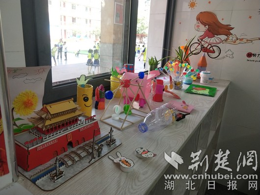 孩子们心灵手巧,逐梦未来,极尽其想象力,天马行空。他们利用废旧的纸盒、塑料、一次性筷子、瓶盖等,形成废品的二次利用。在作品中体现对自己对祖国、对未来的美好畅想。