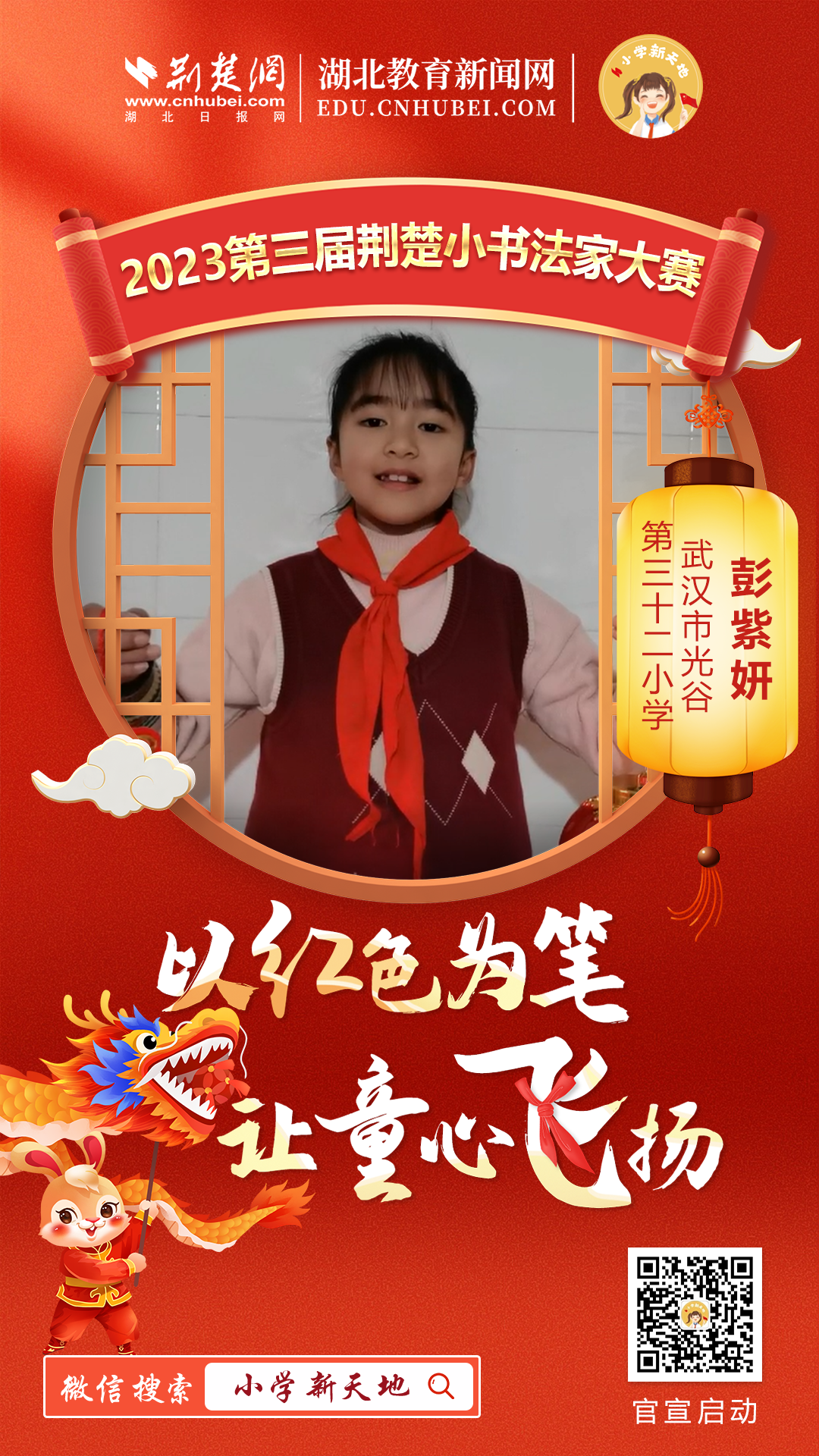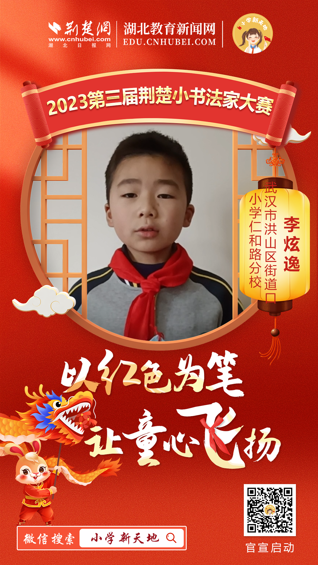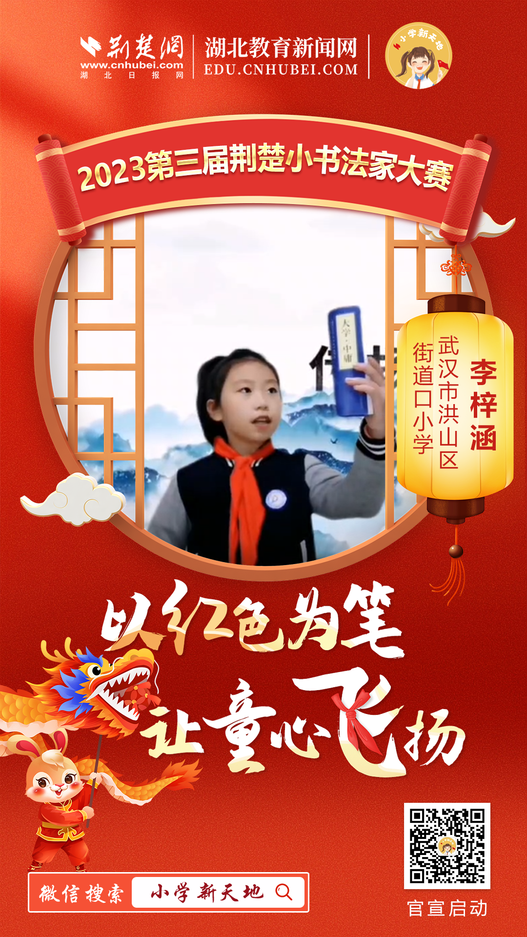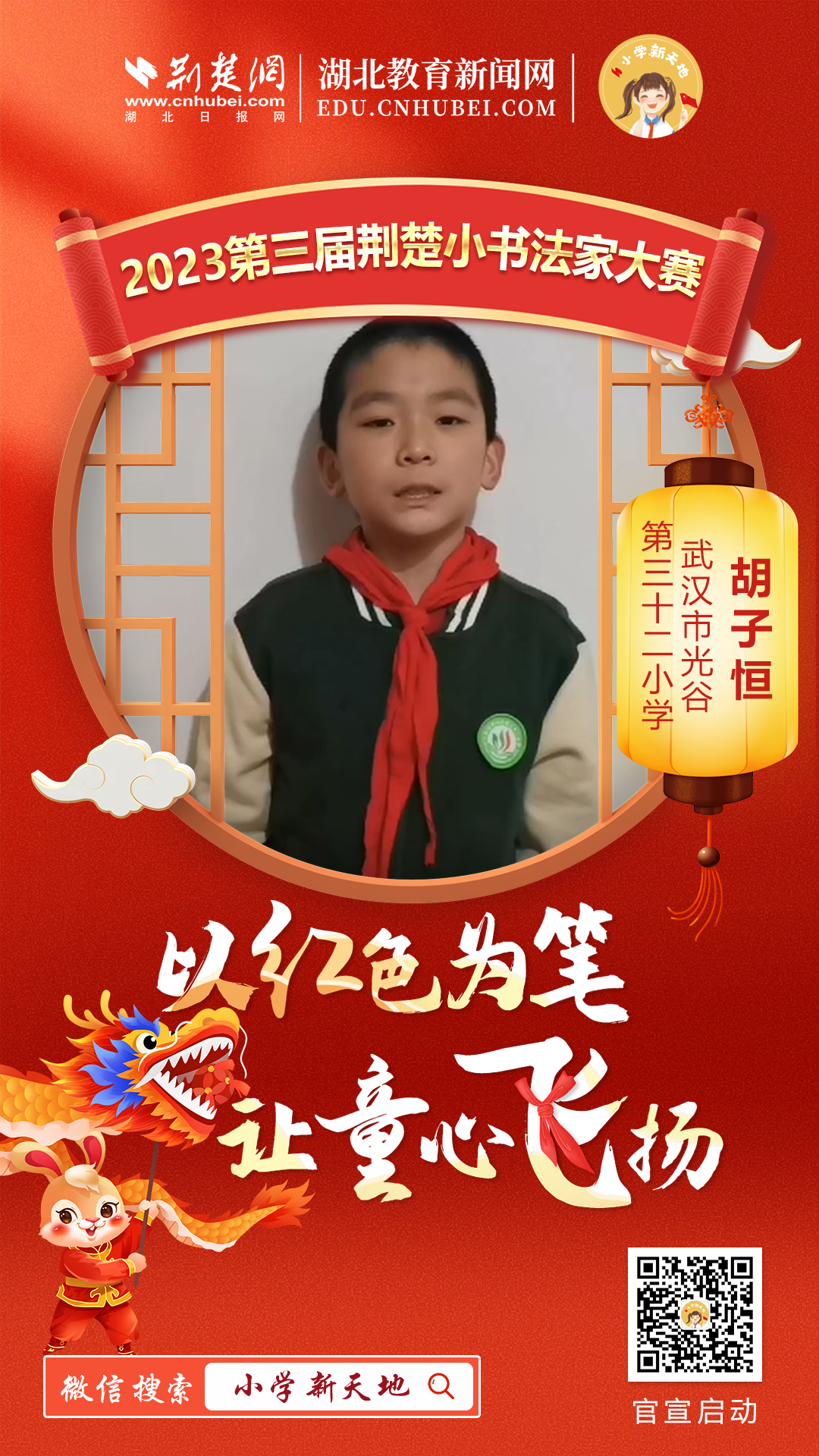 荆楚网(湖北日报网)讯(记者许文秀、何鹏、齐一璇、林杉、唐天琪)以笔之名,书写红色诗词;以诗为媒,传承红色精神。由荆楚网(湖北日报网)、湖北日报传媒集团“小学新天地”教育公众平台共同推出的“以红色为笔 让童心飞扬——‘小学新天地杯’2023第三届荆楚小书法家大赛”大型教育公益活动现已正式启动,有毅力、有审美、爱书法、爱学习的时代少年们快来参赛吧。